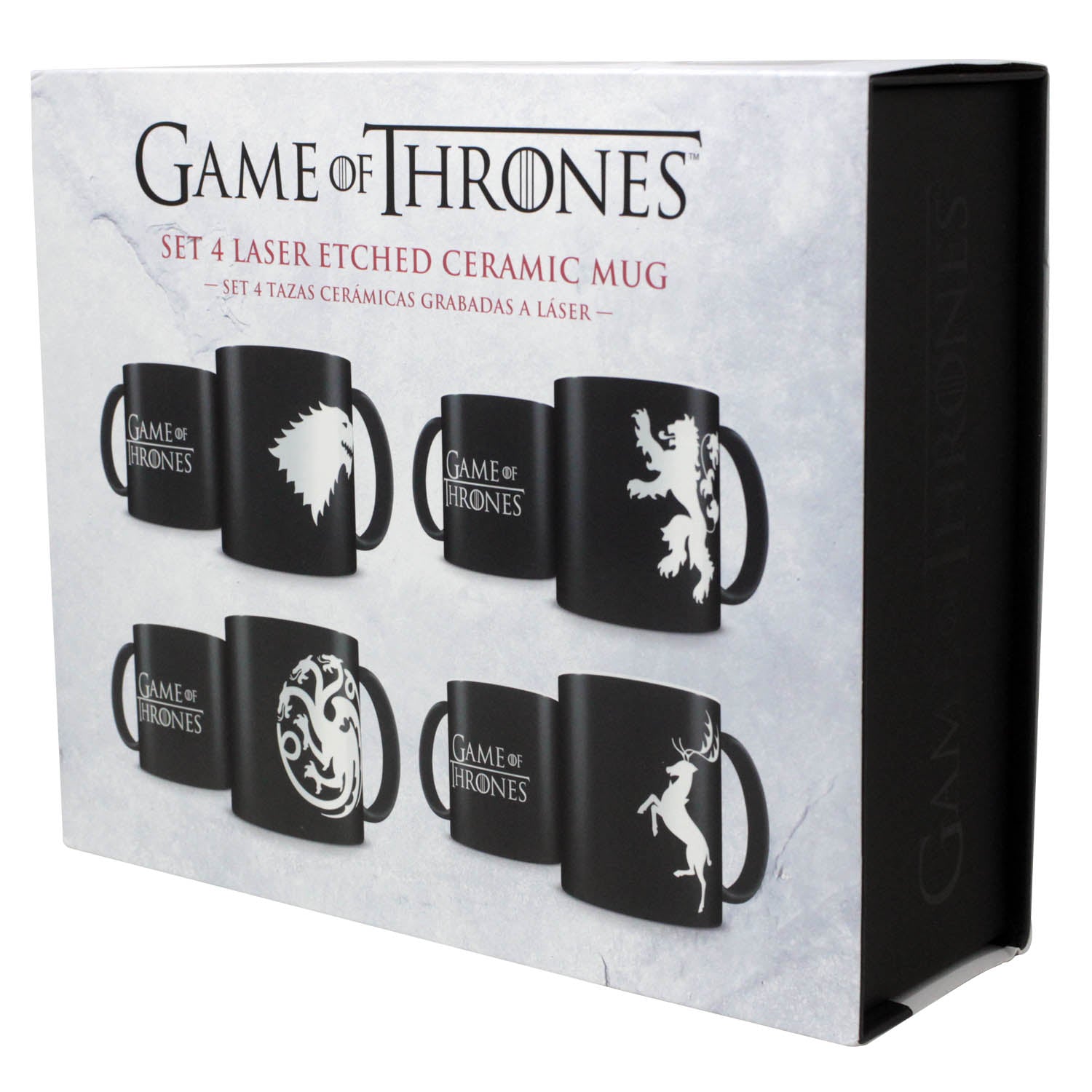 Limited Edition set of 4 laser etched Game of Thrones mugs. Comes packaged in a gifting box. Mugs feature the symbols of the Houses of: Stark, Targaryen, Baratheon, & Lannister.
