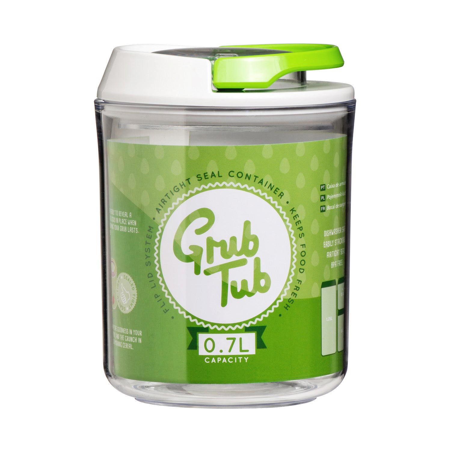 Storing food safely and preserving its goodness, the 0.7 Litre grub tub container with an airtight seal, will help you keep an organized and tidy kitchen. The functional design is made from robust clear plastic allowing you to see what is in the jar. The white lid, with a green handle, fits securely on top ensuring a tight seal to keep your contents fresh for longer. Simply flip the handle up to open and press down to create the airtight seal. Ideal for keeping cereal, dried foods, tea bags, coffee beans, sugar, biscuits, pasta, rice and more close to hand. The durable and practical grub tub storage container will seal the freshness of your favorite foods.