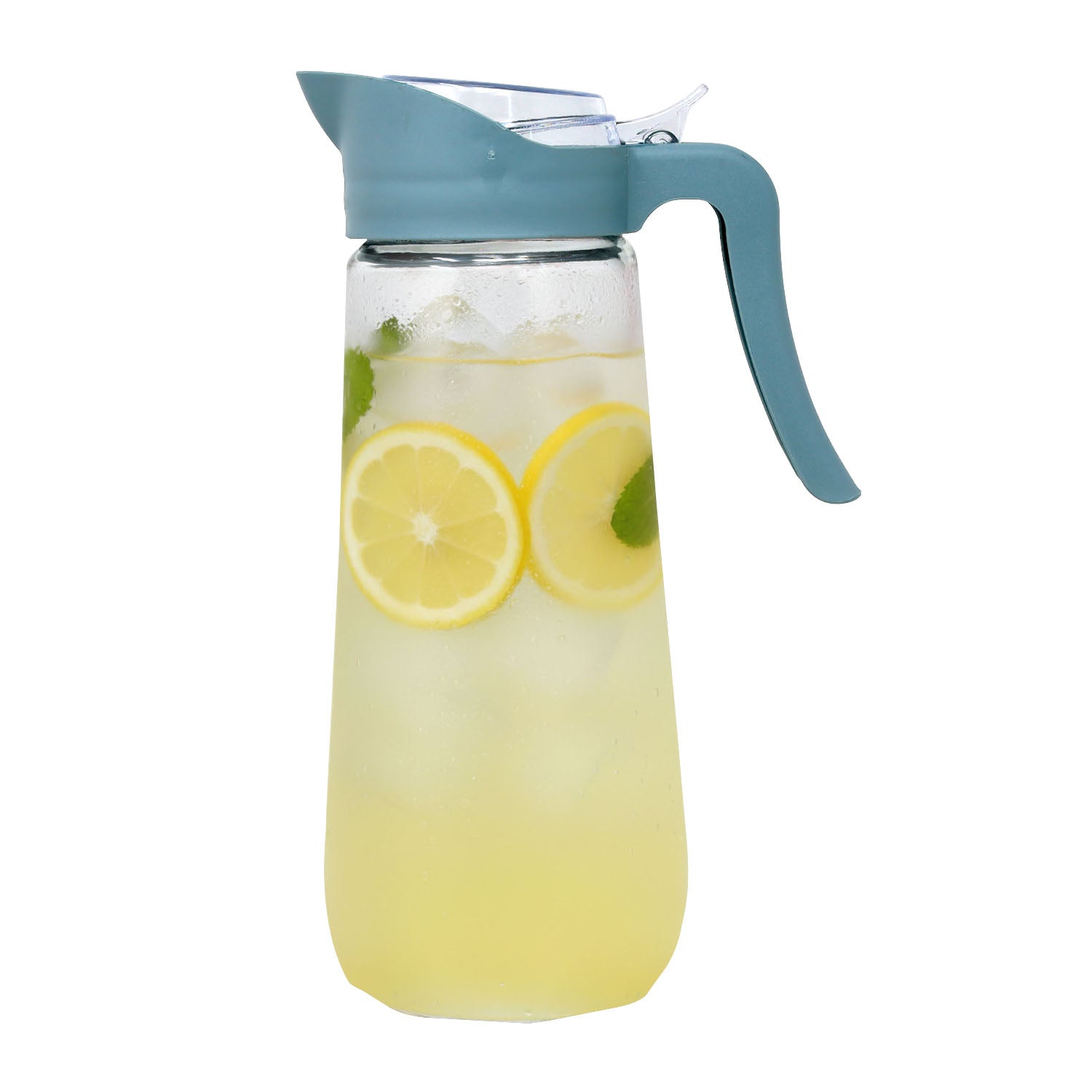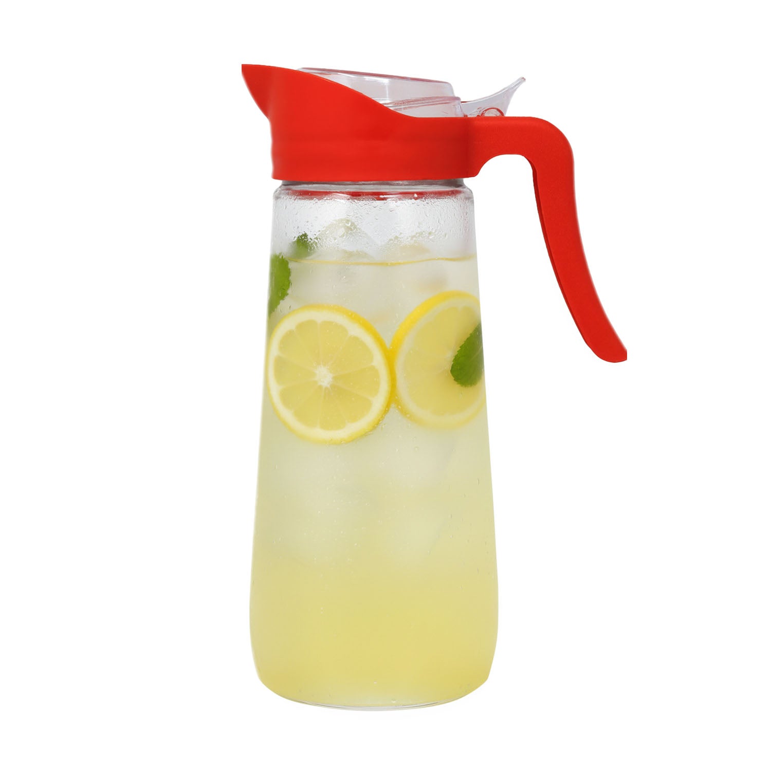 Serve your favourite drinks in style with this 1.6L Clear Glass Pitcher featuring a round body and a durable plastic lid, pourer, and handle in assorted colours (grey, blue, red). Its sleek, modern design makes it perfect for everyday use or entertaining guests. Ideal for water, juice, iced tea, and more—an essential for any kitchen or dining table.