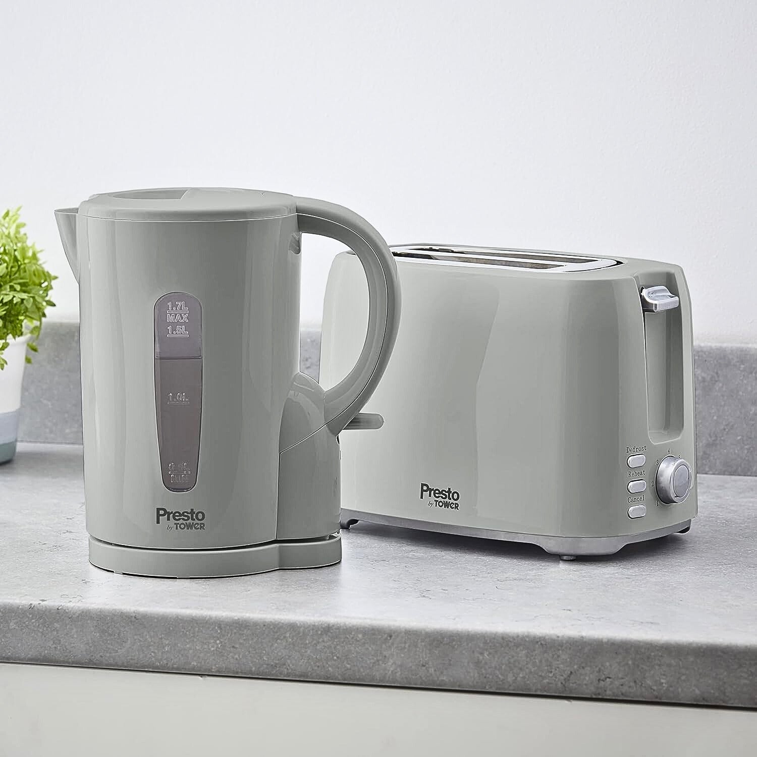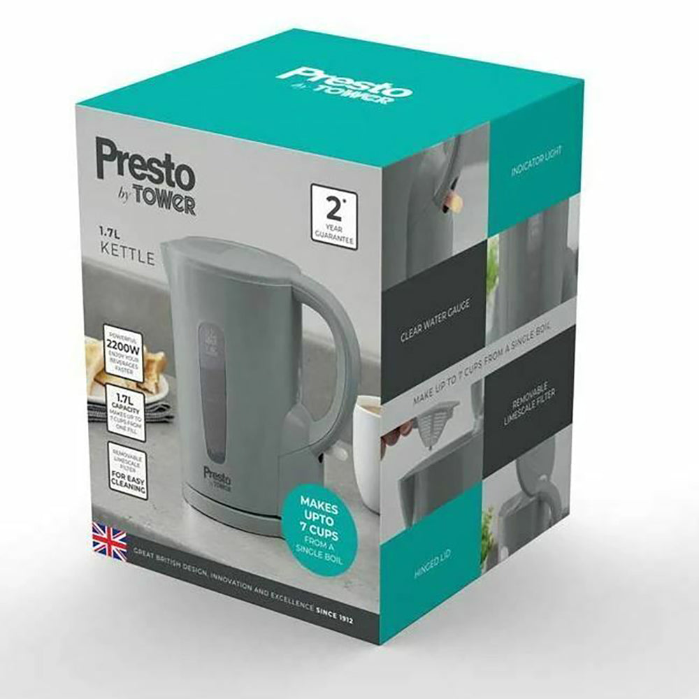 The historic Tower Presto range brings back its affordable and versatile products to people's homes, complete with contemporary features. This electric 2200W kettle has a 1.7-liter capacity that can make up to 7 cups from a single boil, so you can enjoy a nice brew with friends and family. The included filter can be detached which is easy to clean and maintain, ensuring the kettle continues to perform at its best. Also included are boil dry protection and automatic switch-off, which provide added safety when in use. This Presto kettle is a great little addition to the kitchen. Stylish open handle design and Ombre finish. Separate base with cord for portability. Easy manual opening hinged lid. Approx. product dimensions: H20.5 x L13.8 x W21 cm.