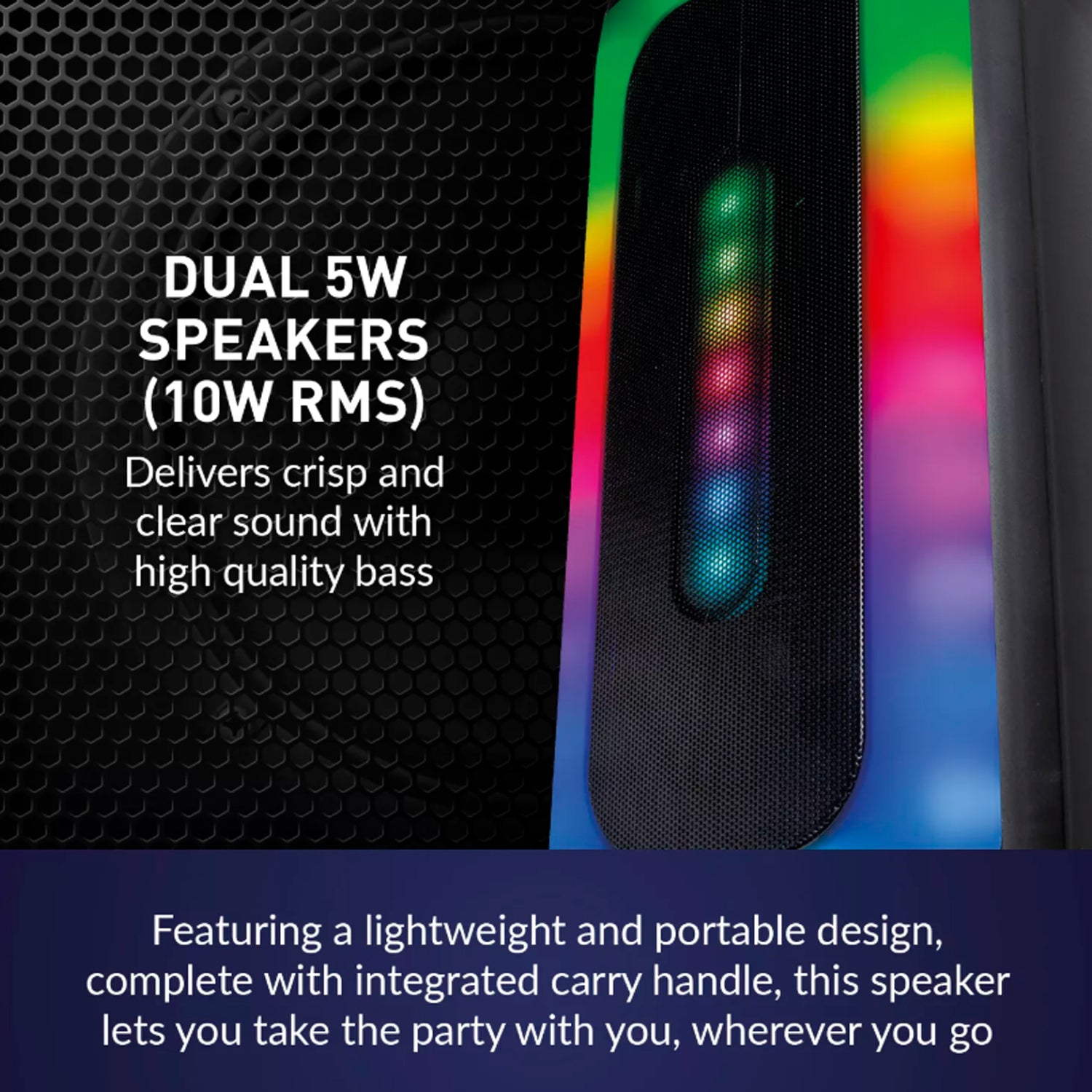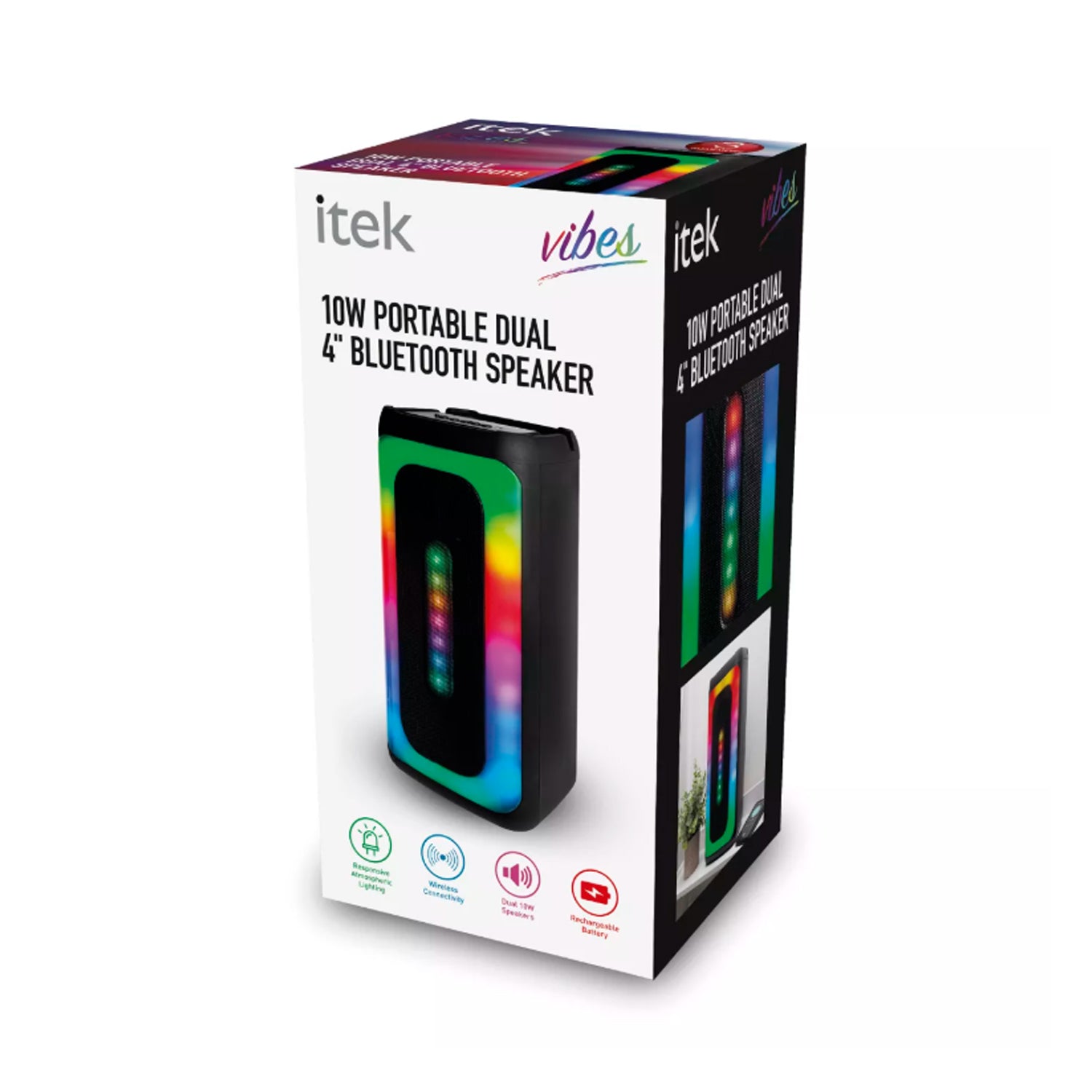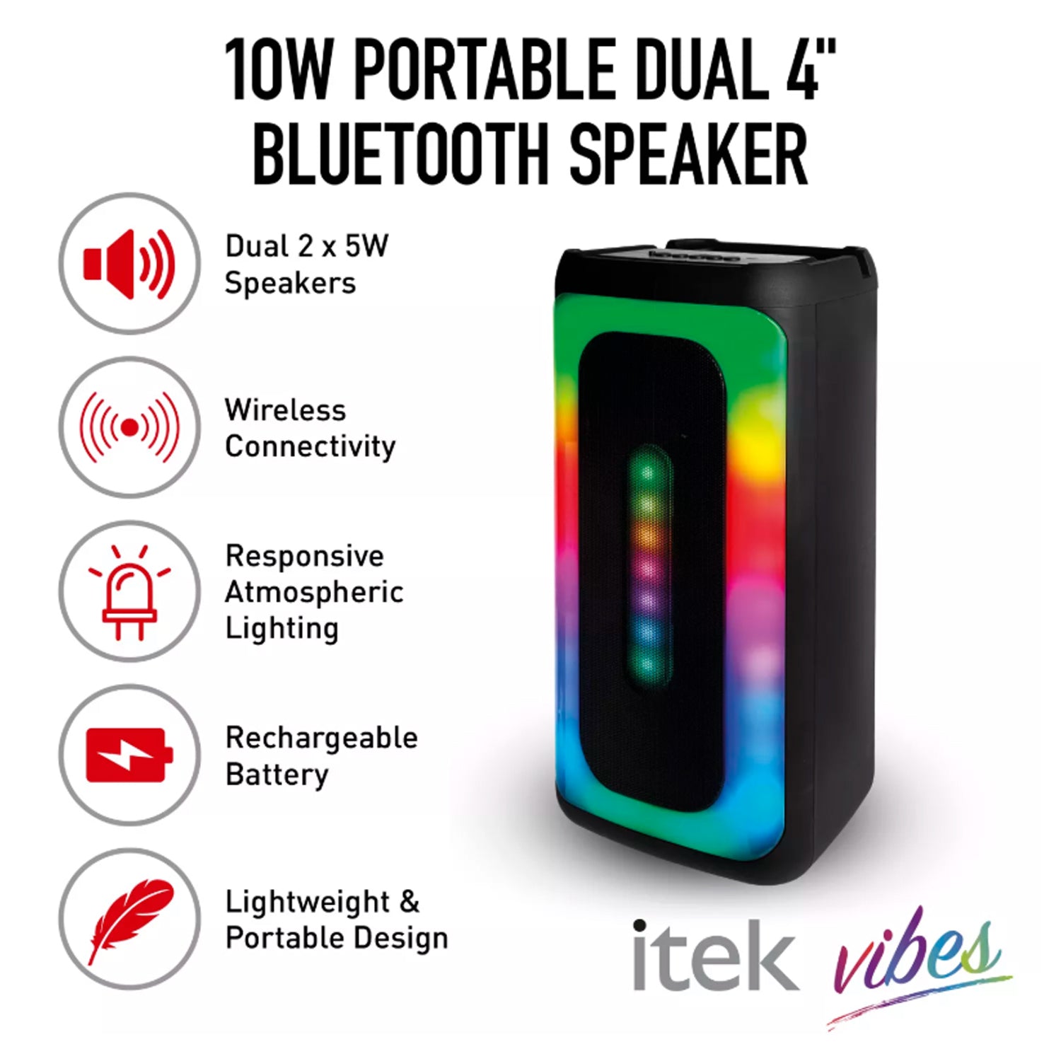 Create a night to remember with this iTek Vibes portable Bluetooth party speaker. The powerful 10W wireless rechargeable dual speaker delivers crisp, clear sound with deep bass. The speaker is compact and includes a built-in carry strap for easy portability. Take the party wherever you go.