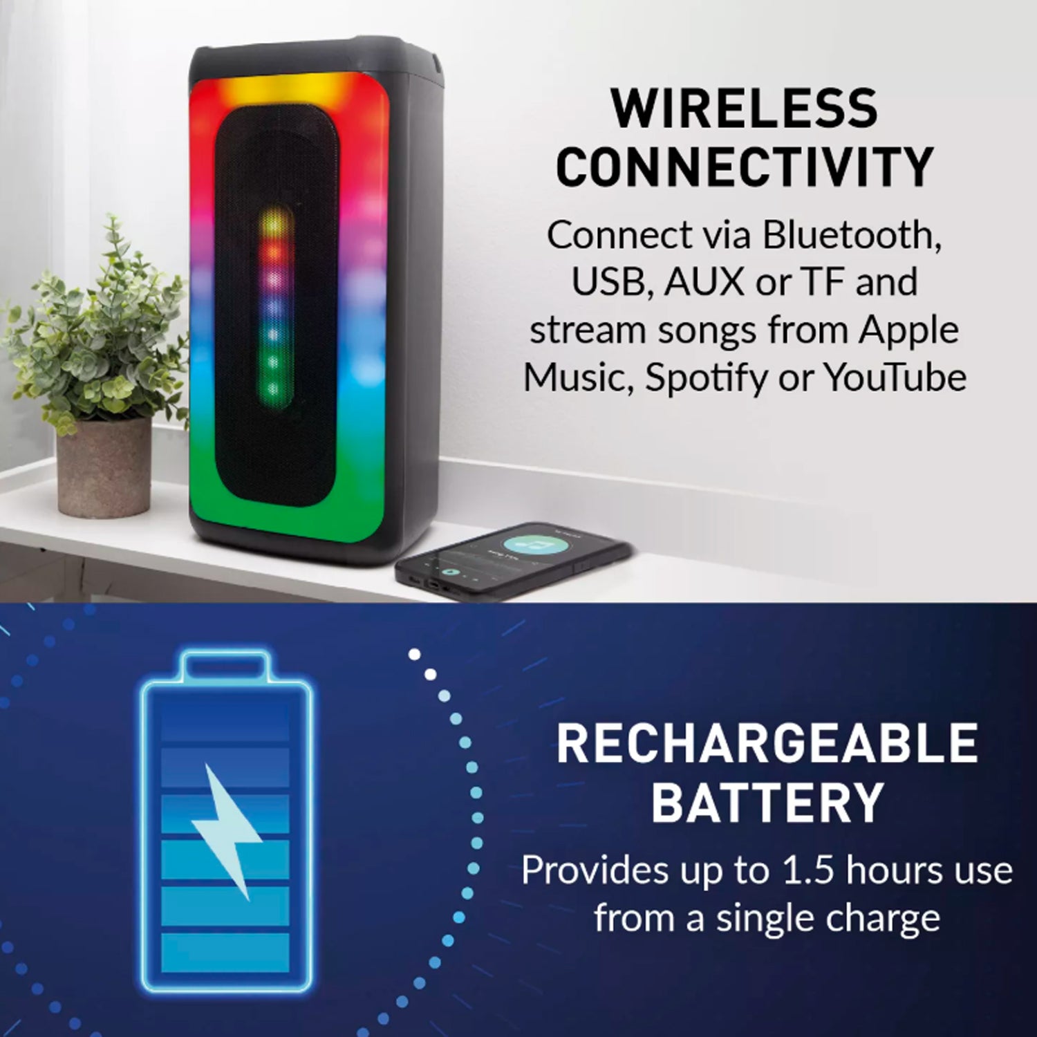 - Connect to any Bluetooth device and stream tracks from YouTube, Spotify, or Apple Music up to 10 meters away.