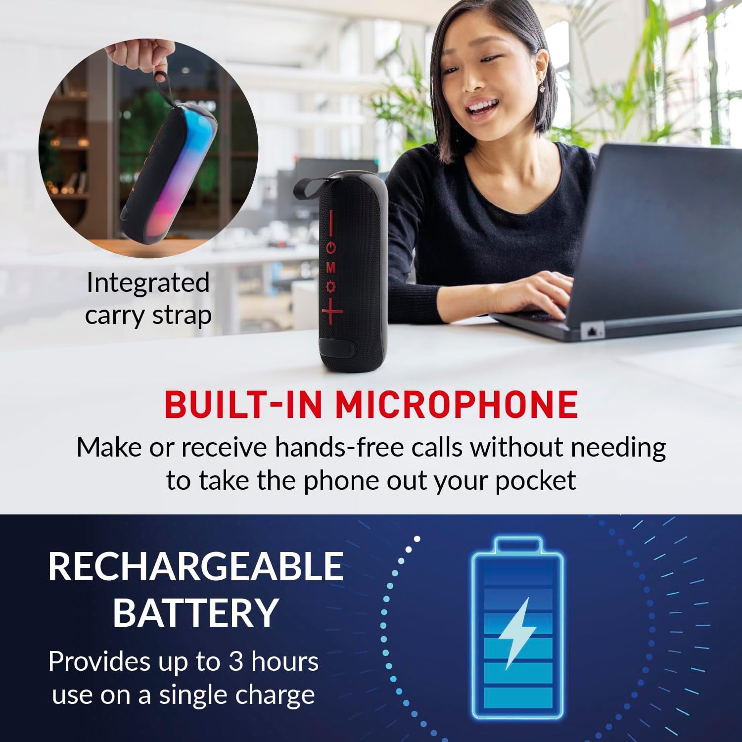- Offers hands-free call functionality for added convenience and TWS capability to connect with a second speaker for immersive stereo sound.