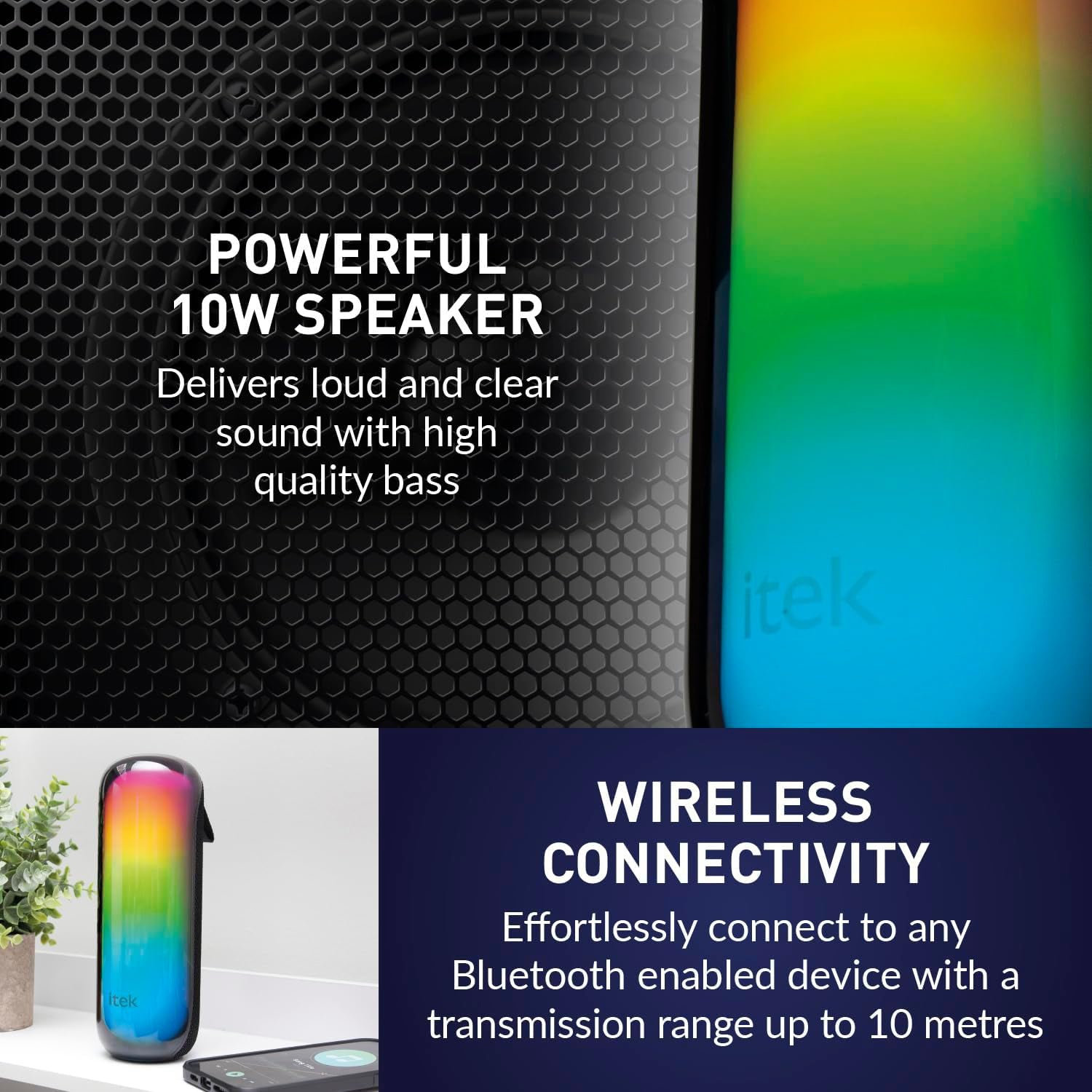 - Powerful 10W speaker delivers loud, bass-rich sound and connects wirelessly via Bluetooth.