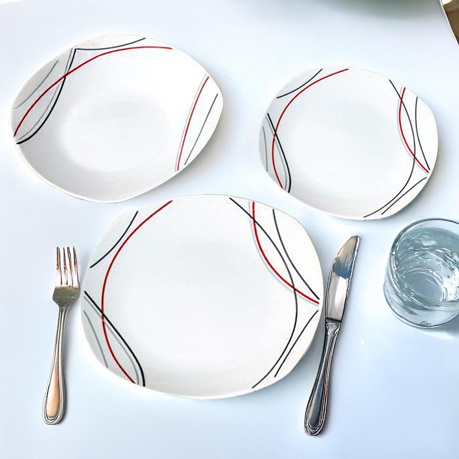 12-pc Dinner Set White Soup Dessert Plates Red Black