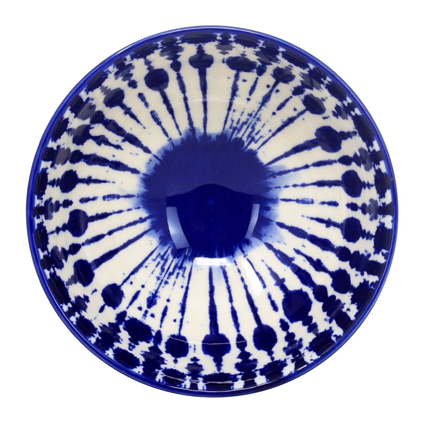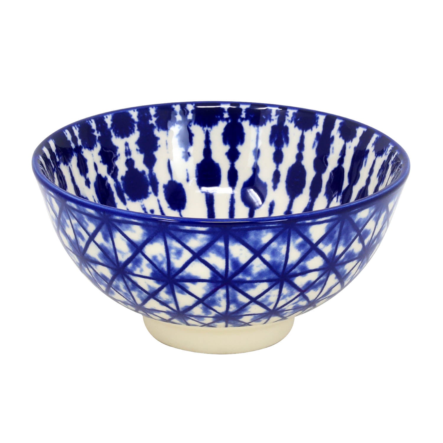 - Has a round shape, and a traditional Japanese-style bowl in a rich blue with crisscross motif forming a diamond grid across the bowl’s exterior.