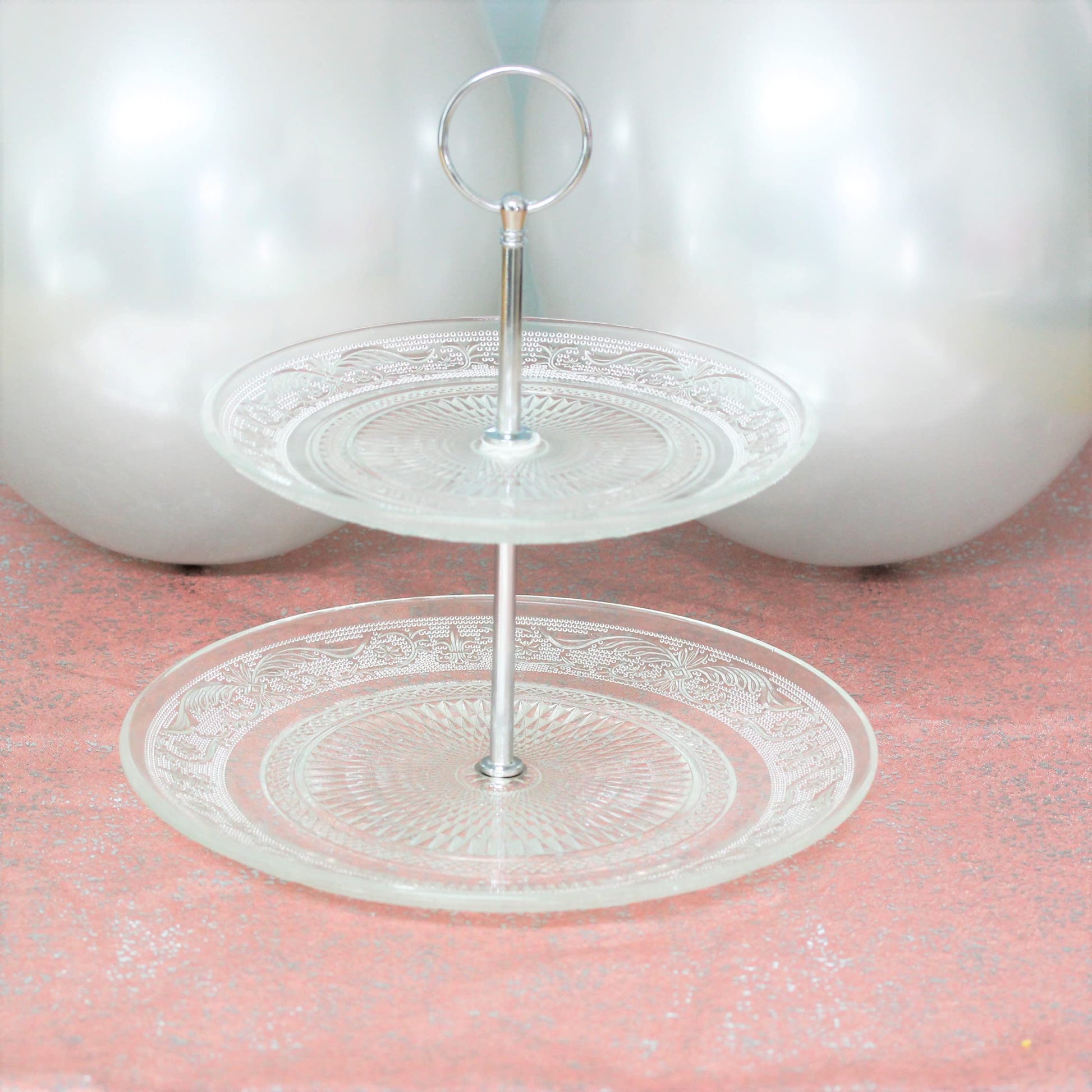 - Two tiers provide ample space to display and serve cakes, pastries, and desserts