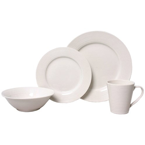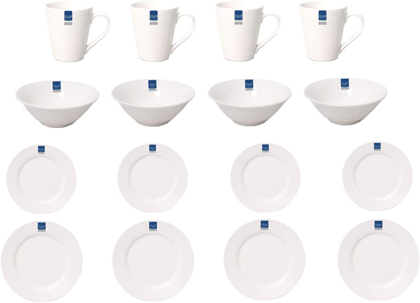 The Solar White Dinner Set - 16 Piece includes dinner plates, side plates, bowls and mugs for four place settings, all in a fine white porcelain.