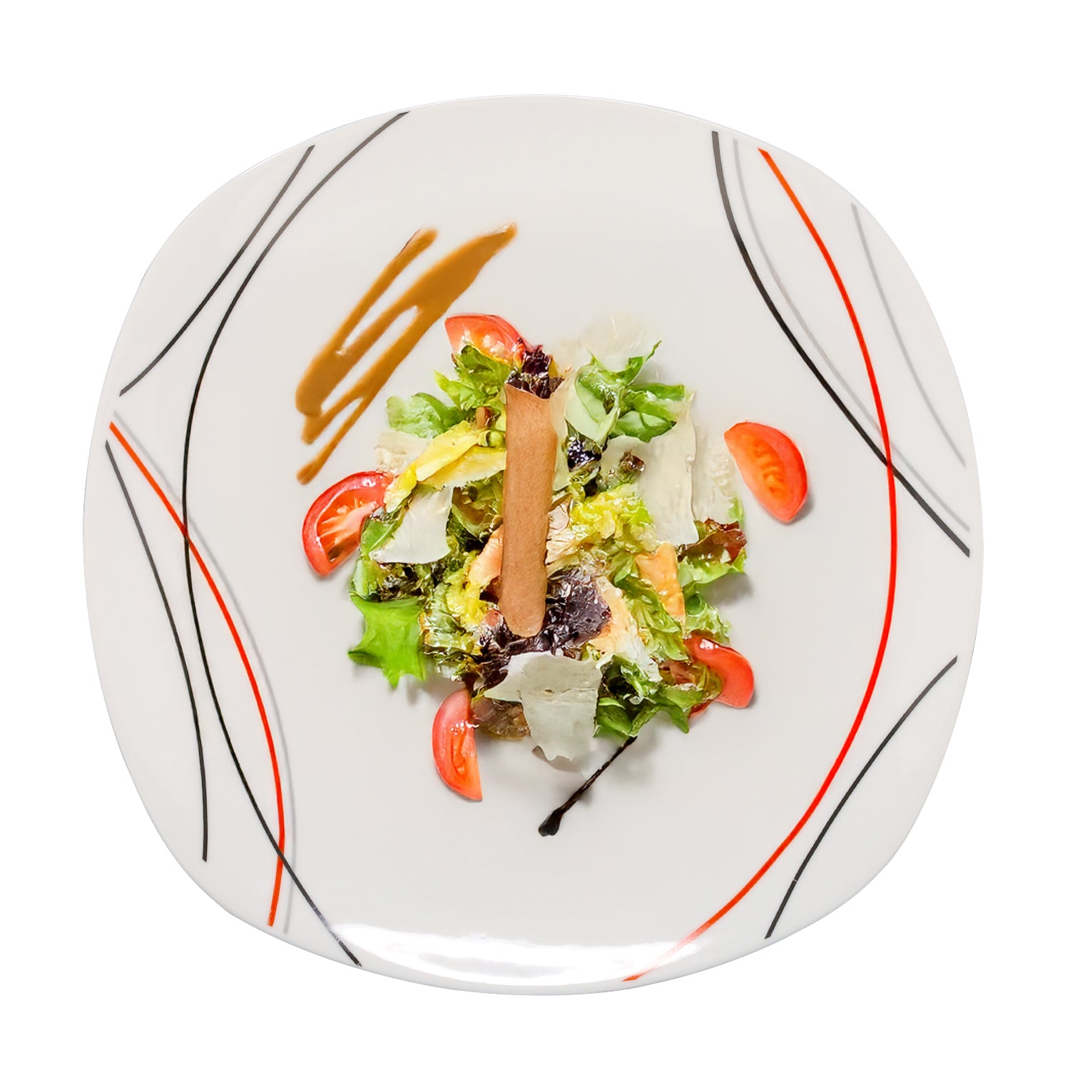 - Rounded square design in white, decorated with sleek curved lines in red, grey, and black for a modern and elegant look.