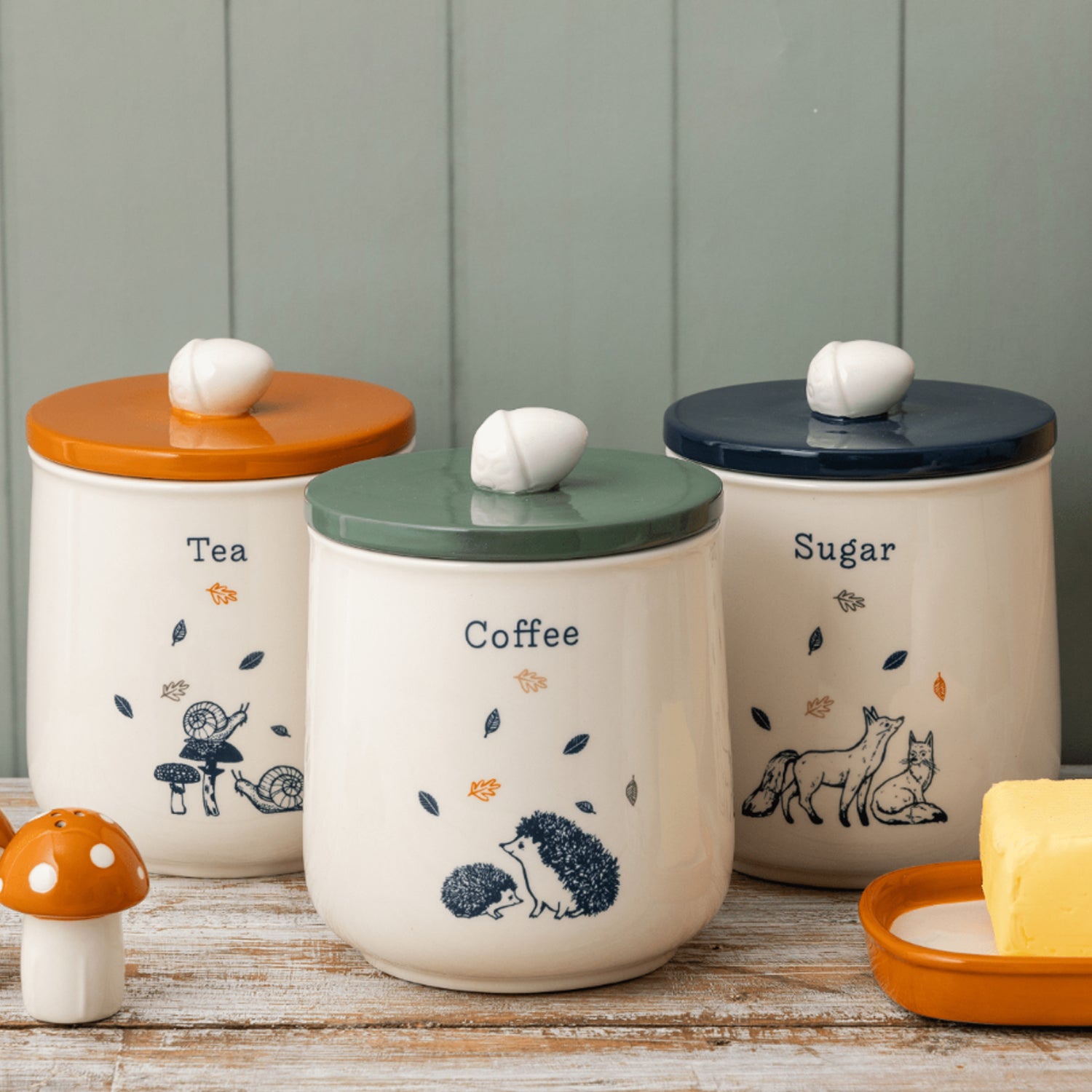 - Co-ordinating tea and coffee storage jars are also available. The Woodland Sugar Storage Jar is part of a fully co-ordinating collection, including other ceramic tabletop accessories.