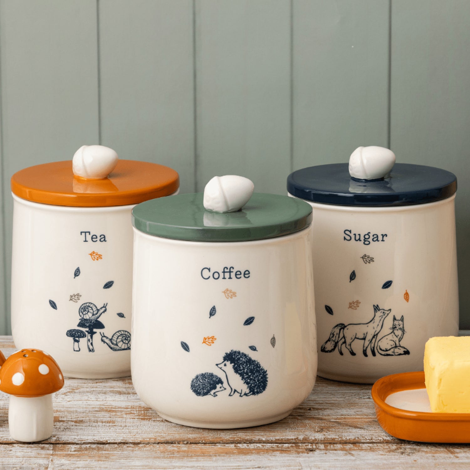 - Co-ordinating sugar and coffee storage jars are also available. The Woodland Tea Storage Jar is part of a fully co-ordinating collection, including other ceramic tabletop accessories.