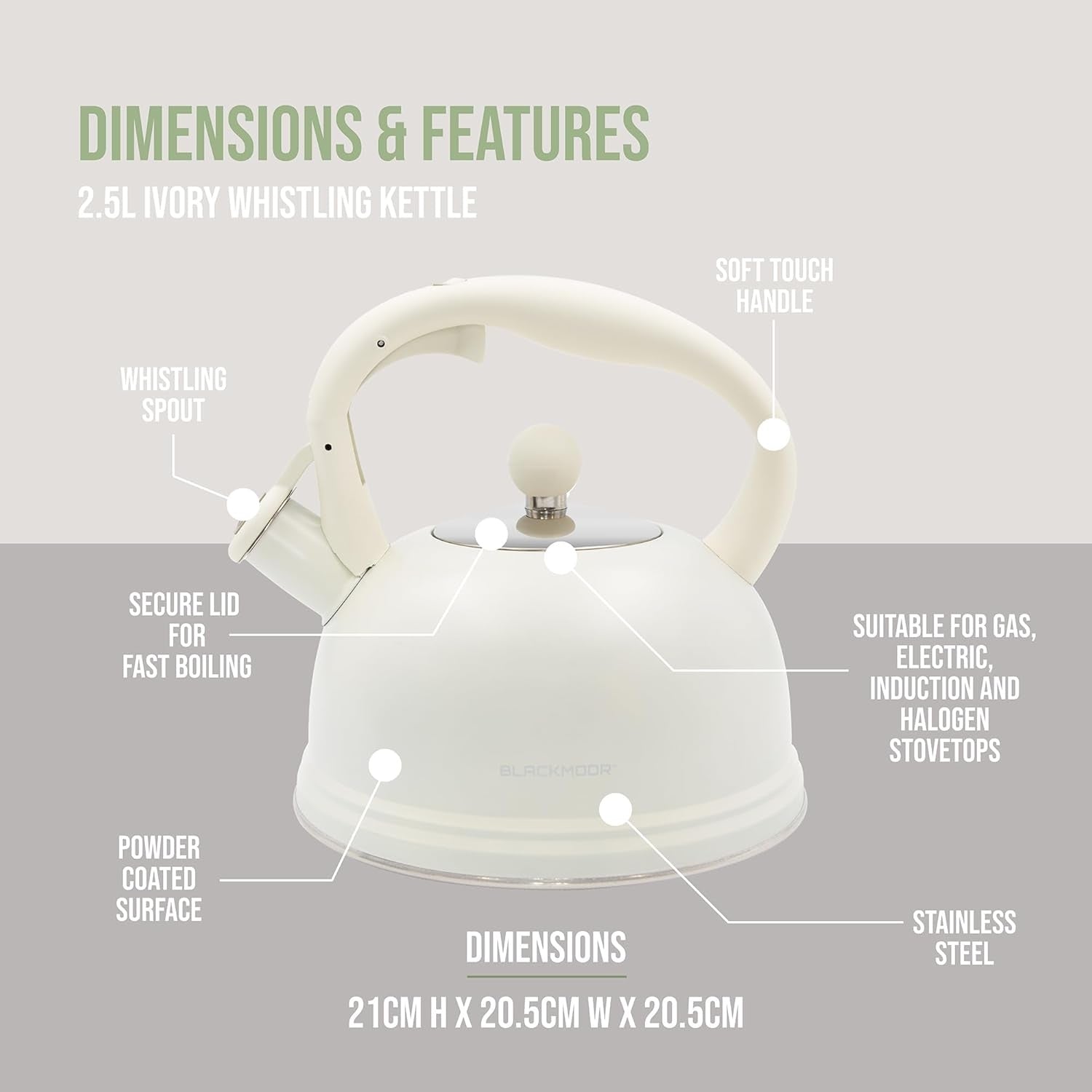 Elevate your kitchen with our elegant stainless steel stovetop kettle, designed in a sleek matte ivory finish. The whistling spout signals when the water is boiling, while the soft-touch handle ensures a comfortable and safe grip. With a generous 2.5-liter capacity, it's ideal for brewing multiple cups of tea or coffee. For easy cleaning, wipe with a soft sponge or cloth and use a bit of vinegar or lemon to keep it sparkling.