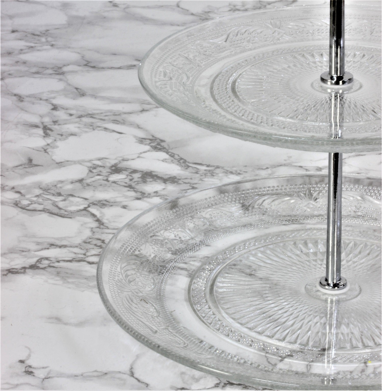 Ideal 2 tier glass cake stand for weddings, birthdays, anniversaries and parties. This is also perfect for afternoon tea session. Made from durable clear glass with embossed detailing. 3 different sized plates: Top 18 x 1.5cm and Bottom 23 x 1.5cm. Approx 22cm Height. Assembly instructions included.