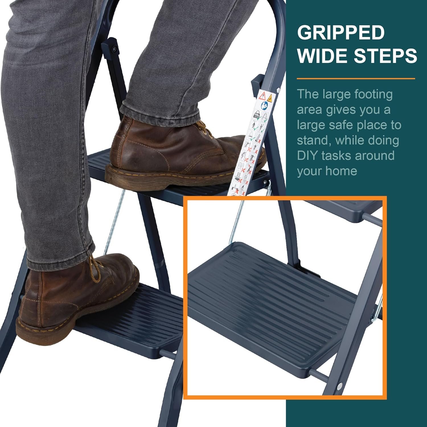- 2-tier step ladder provides a boost in height for accessing high-up cupboard spaces, cabinets and shelving units.