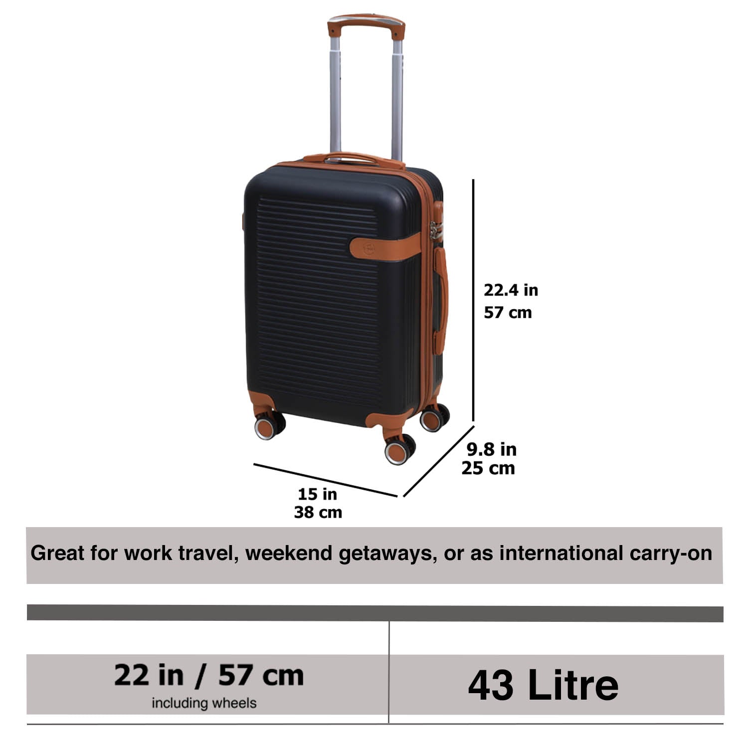 - Suitcase Size - With Wheels: H: 57 x W: 38 x D: 25cm / Without Wheels: H: 52 x W: 38 x D: 25cm / Capacity: 43 Litre / Weight: 2.9kg (6.4 lbs)