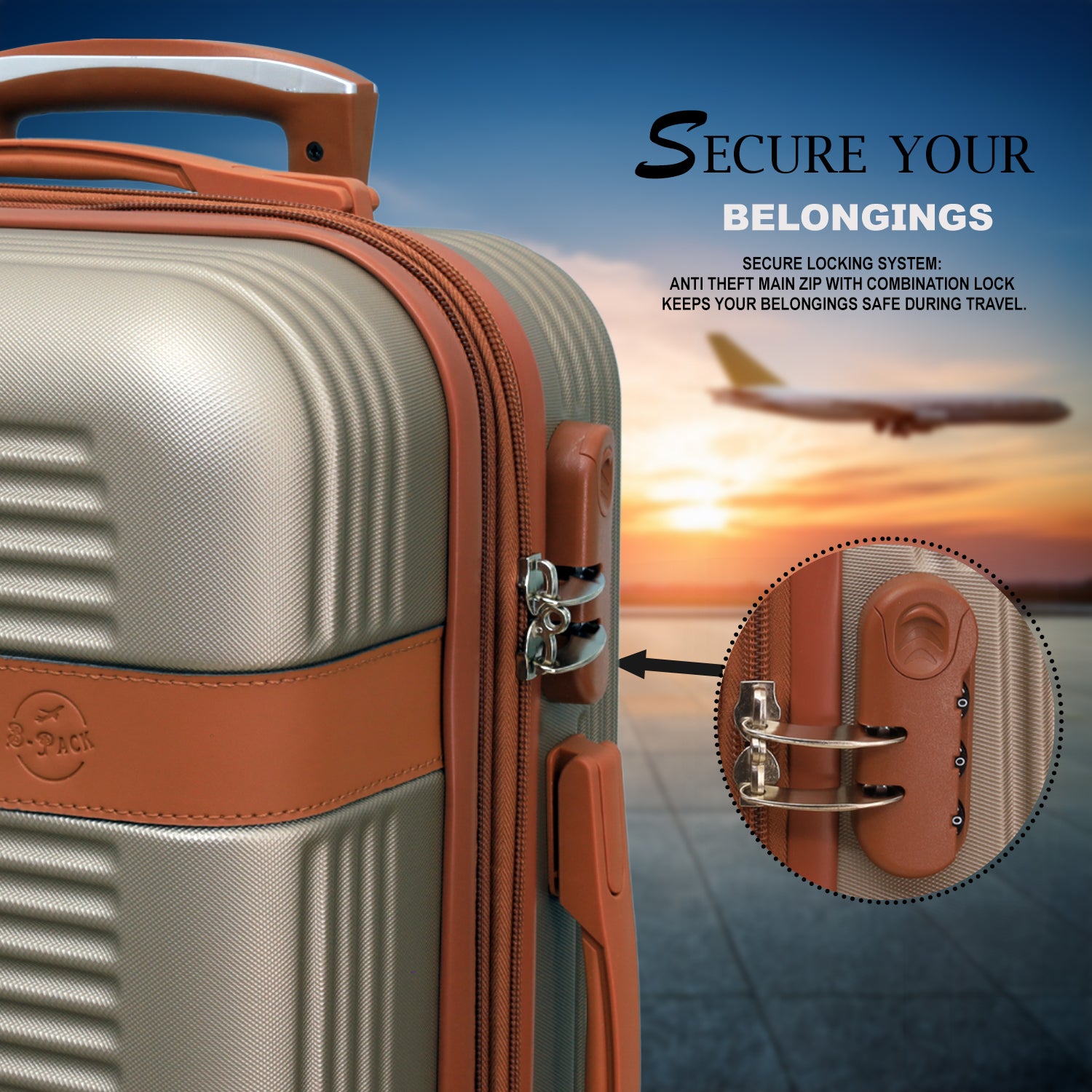 Travel smart and in style with this 20'' Champagne Trolley Case luggage, designed for maximum capacity, ease of movement, and a sleek leather-stripe detail. It features a secure locking system and smooth-rolling 360° wheels, ensuring convenience and peace of mind wherever your journey takes you.