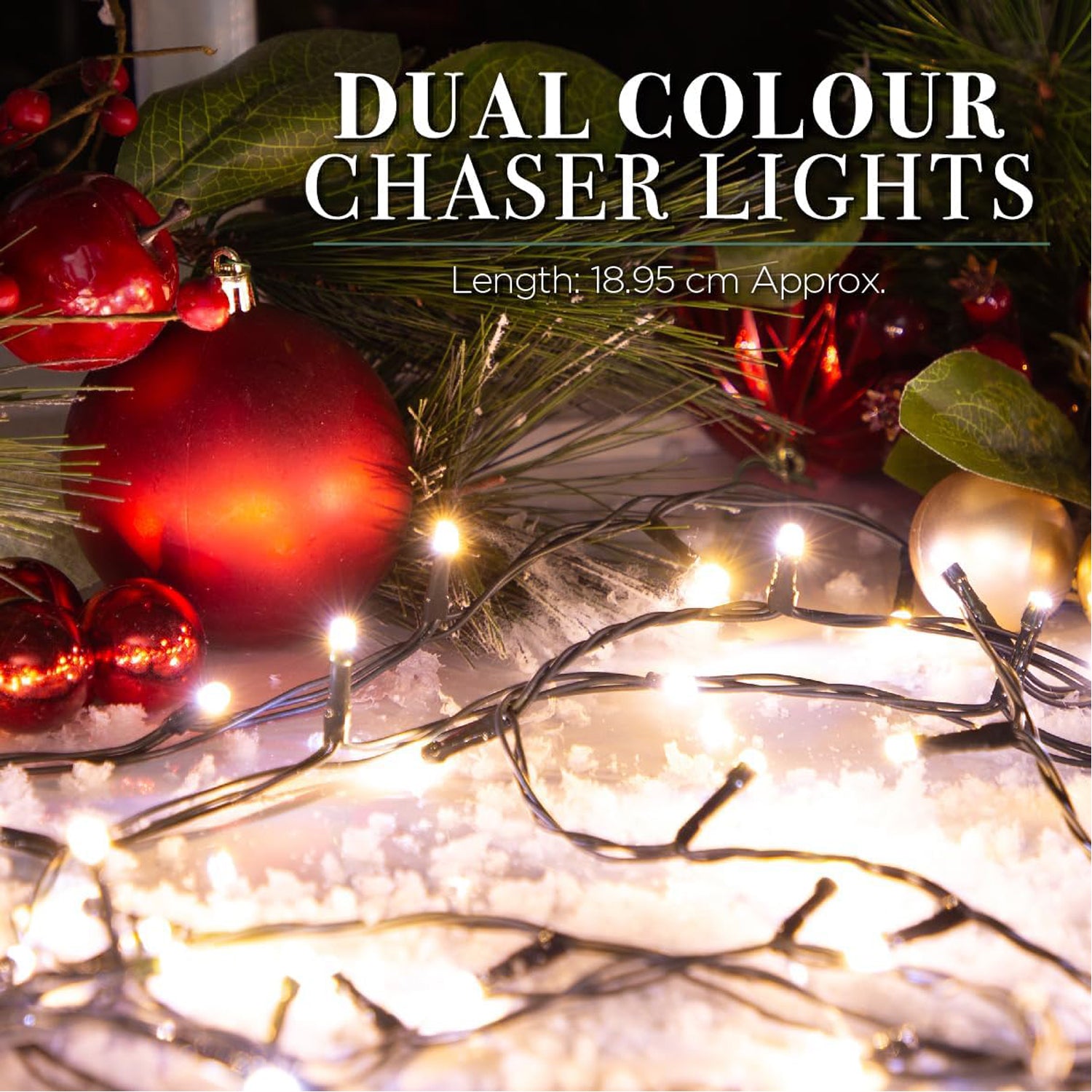 - This set of 200 chaser Christmas lights provides all the colourful illumination you need to decorate the inside or outside of your home this festive season! They come in a mix of bright white and warm white colours and can be combined for a dual white shade.