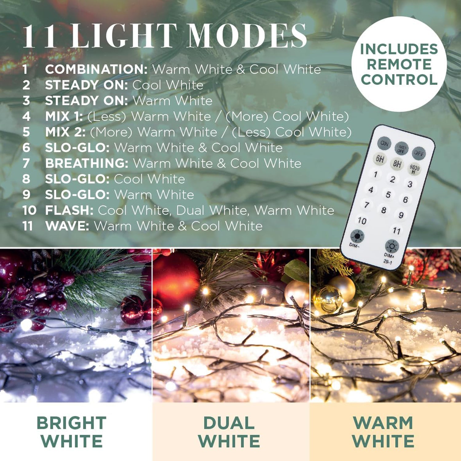- Choose between a total of 11 different light modes, including steady on, slow glow, sequential, chaser flashing, waves, slow fade, and more, as well as various combinations.