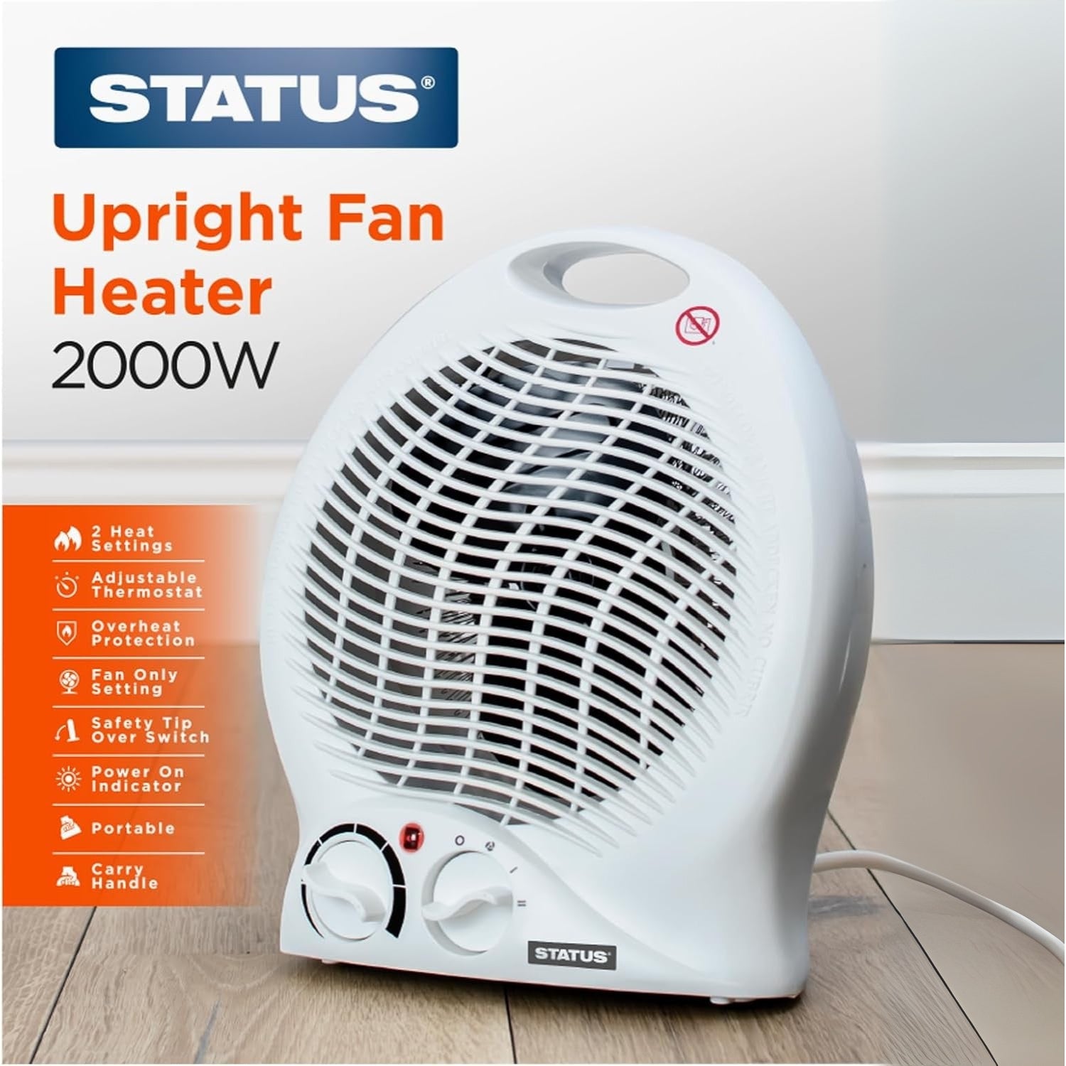 The discreet, portable 2000W fan heater from Status features an adjustable thermostat and fan-only setting, meaning as well providing instant heat it can also improves air circulation, reducing humidity, damp and chance of mould. The fan heater operates comfortably in free standing position.