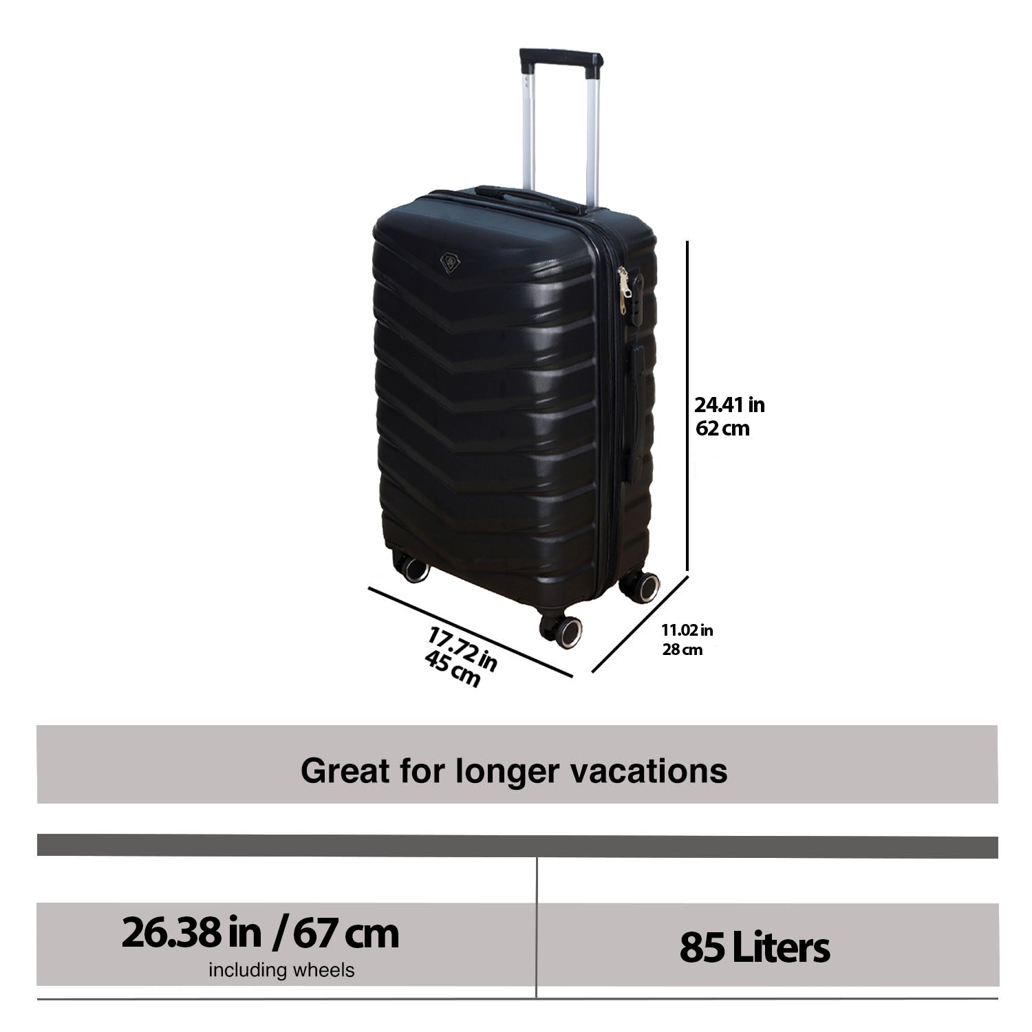 - Suitcase Size - With Wheels: H: 67 x W: 45 x D: 28cm / Without Wheels: H: 62 x W: 45 x D: 28cm / Capacity: 85 Litre / Weight: 3.2kgs (7.05 lbs)