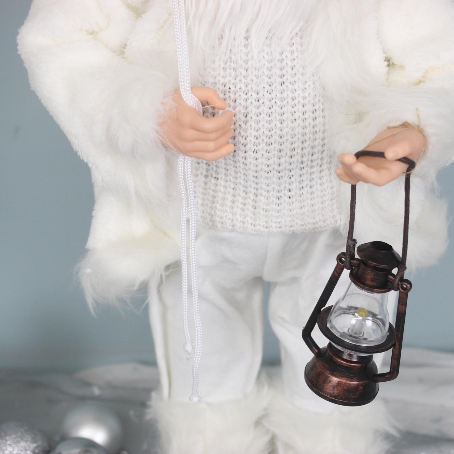 This beautifully detailed, standing Father Christmas in his furry white coat holding a little lamp is a unique twist to his usual look giving that more warm vibe this holiday!