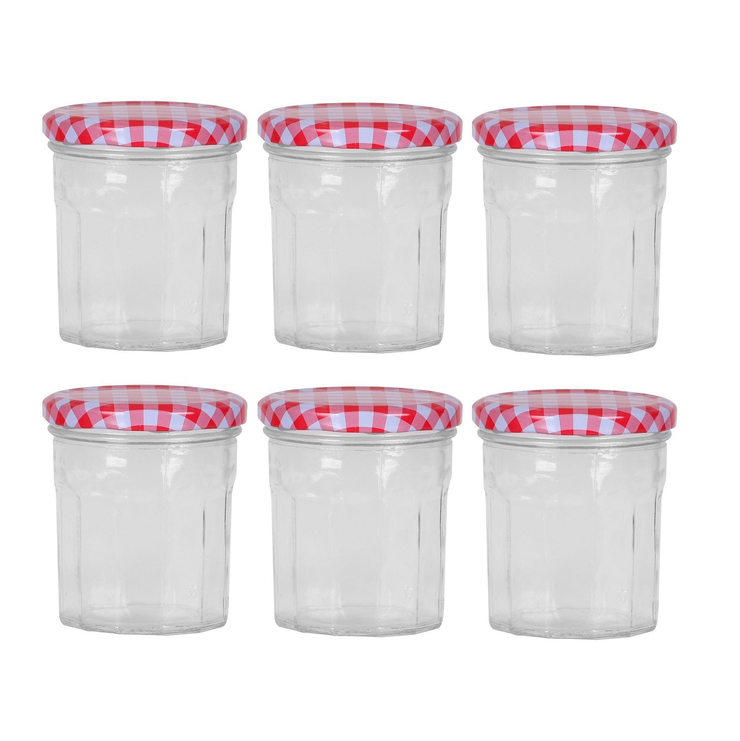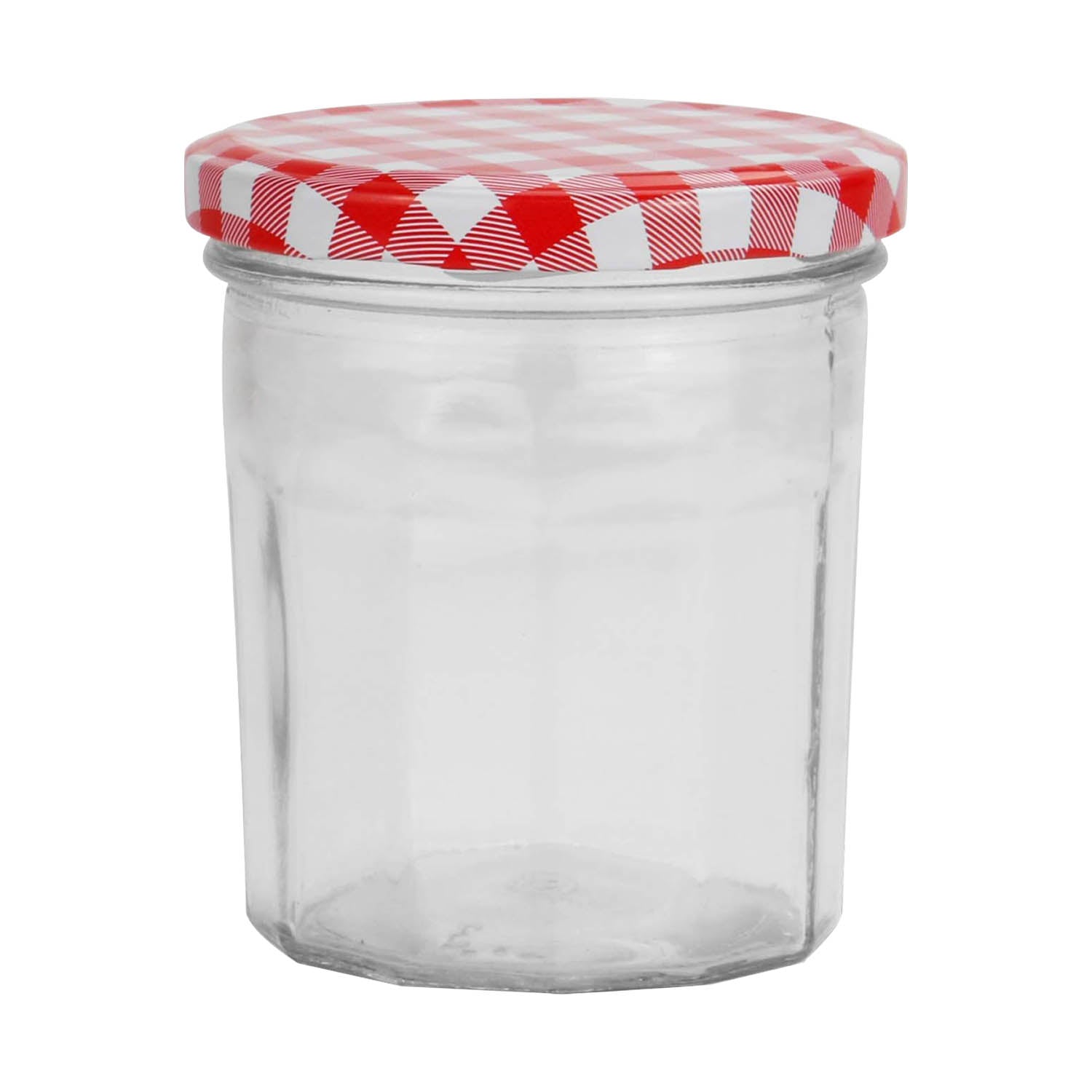 - Crafted from durable clear glass with a smooth cylindrical shape, each jar is topped with a twist-off tin lid in a classic red-and-white checkered pattern for a vintage, farmhouse-inspired look.