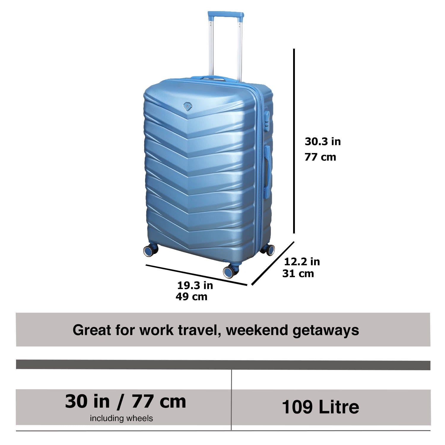 - Suitcase Size - With Wheels: H: 77 x W: 49 x D: 31cm / Without Wheels: H: 72 x W: 49 x D: 31cm / Capacity: 109 Litre / Weight: 4kg (8.8 lbs)