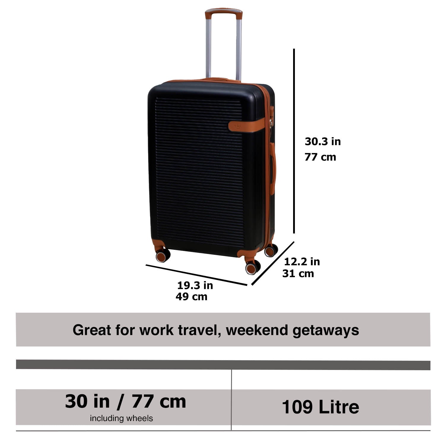 - Suitcase Size - With Wheels: H: 77 x W: 49 x D: 31cm / Without Wheels: H: 72 x W: 49 x D: 31cm / Capacity: 109 Litre / Weight: 4kg (8.8 lbs)