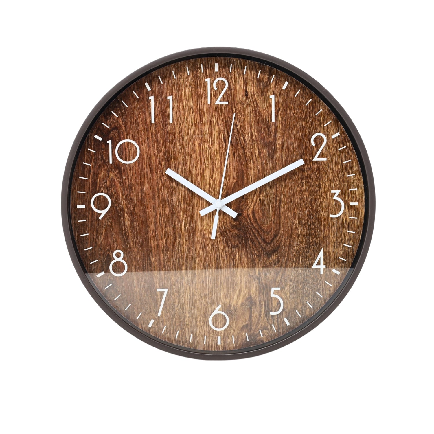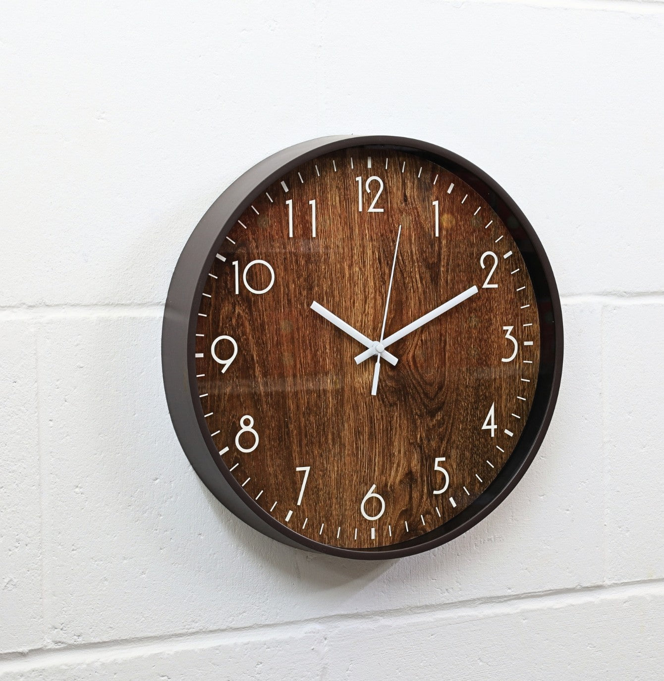 - Round clock face with a dark brown woodgrain-style dial, white Arabic numerals, and hands.