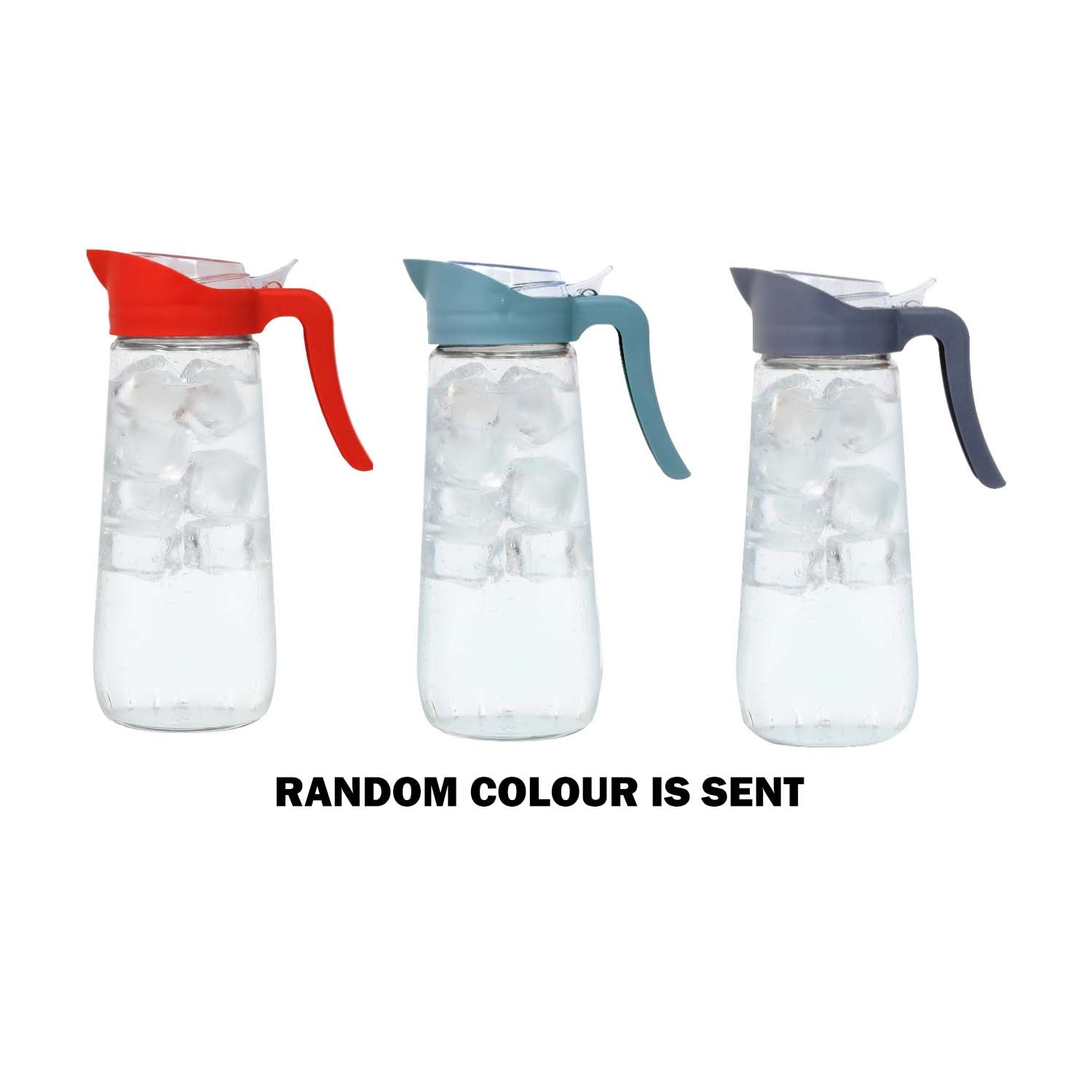 - Round body with a modern look; features a plastic lid, pourer, and handle in assorted colours—grey, blue, or red. (random colour pitcher is sent).