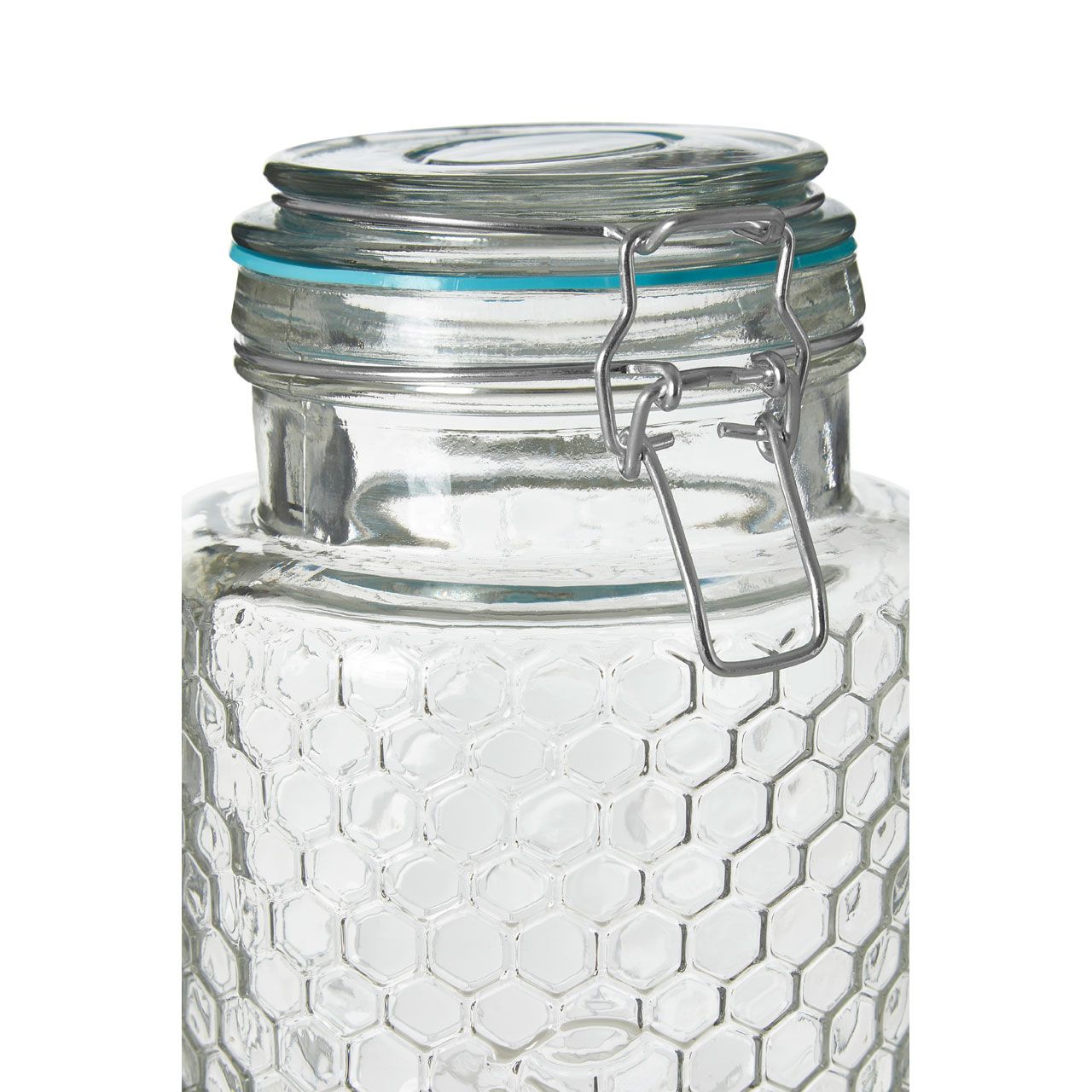 - This clear glass storage jar features a distinctive honeycomb pattern.