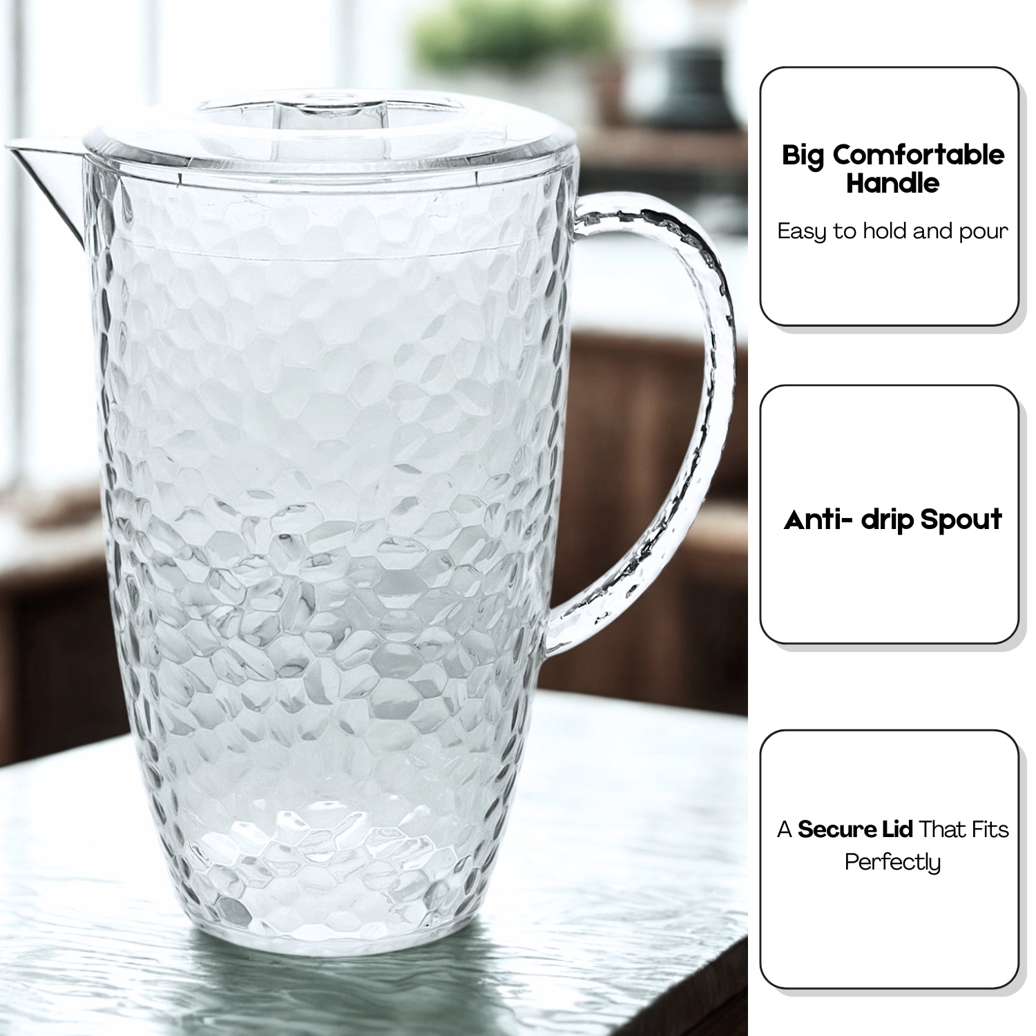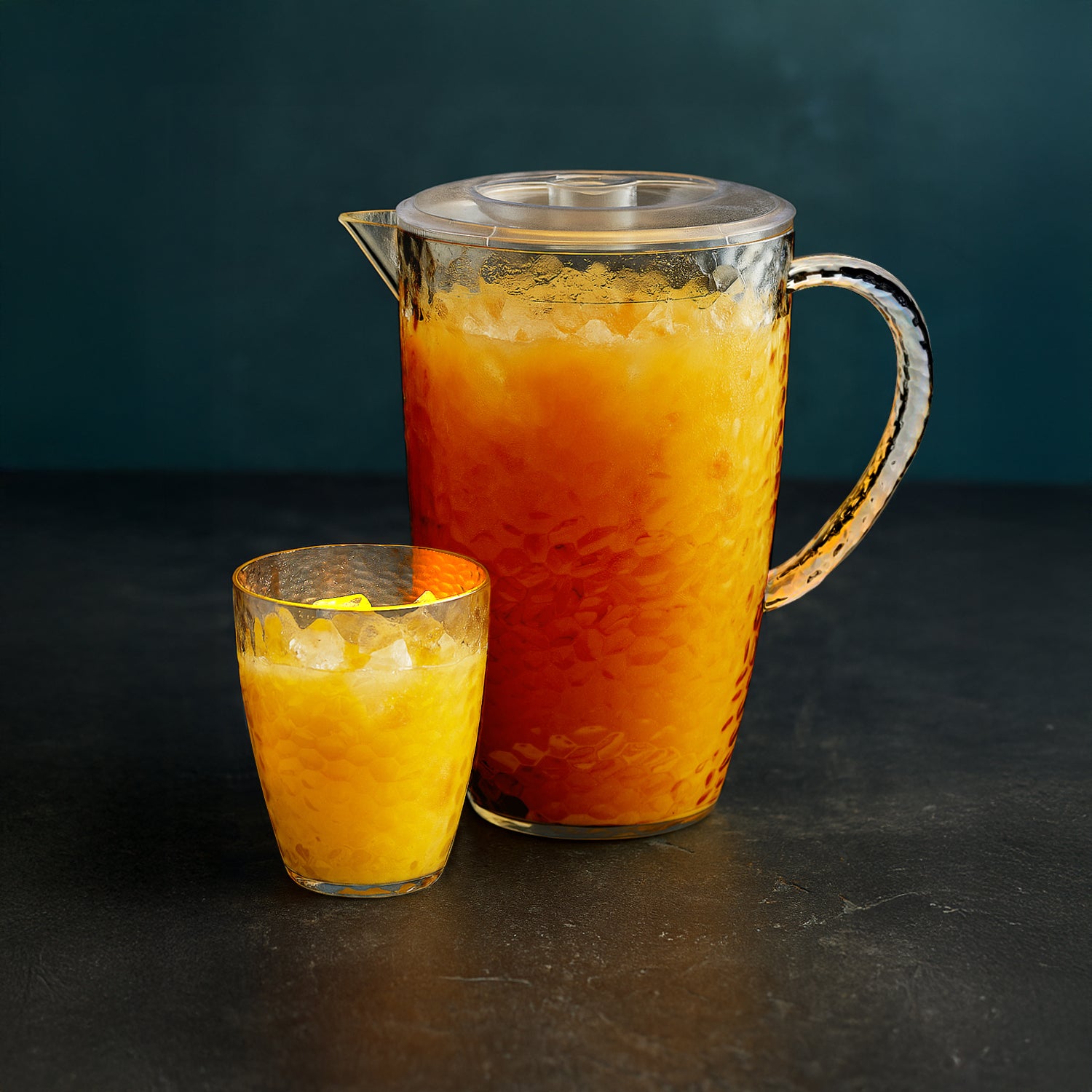 The UNIQUE HOME LIVING Dimple 10-piece Pitcher and Tumbler Set is the ultimate solution for hassle-free beverage service. Crafted from lightweight and durable plastic, this set is perfect for picnics, parties, patios, or daily family use. This food-safe drinkware offers the perfect combination of convenience, style, and practicality for serving water, iced tea, juice, or lemonade. Hand wash recommended to maintain its elegant look and durability.