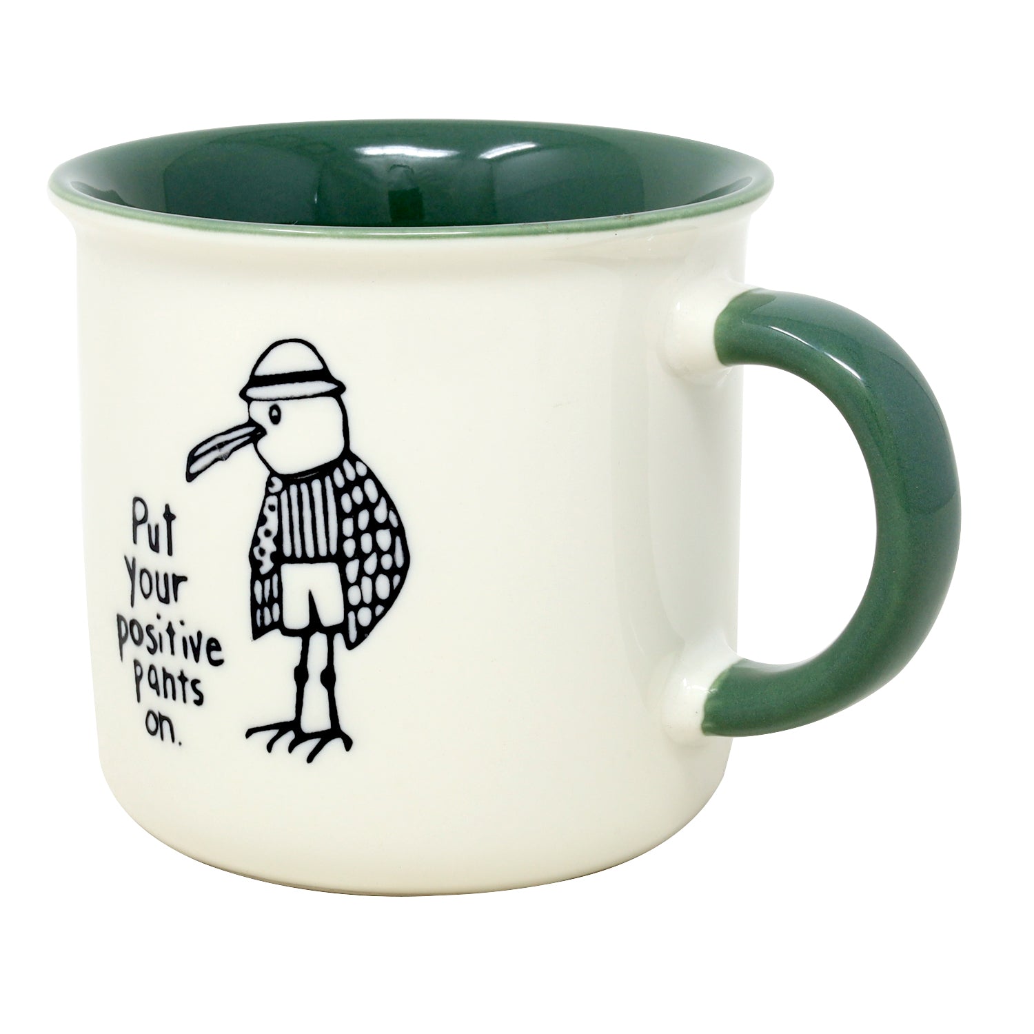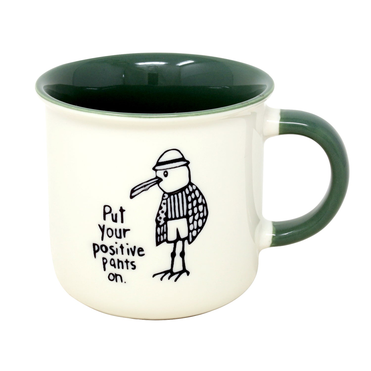 - Features a quirky bird illustration with the phrase “Put your positive pants on”; round shape with cream exterior and deep green handle and interior.