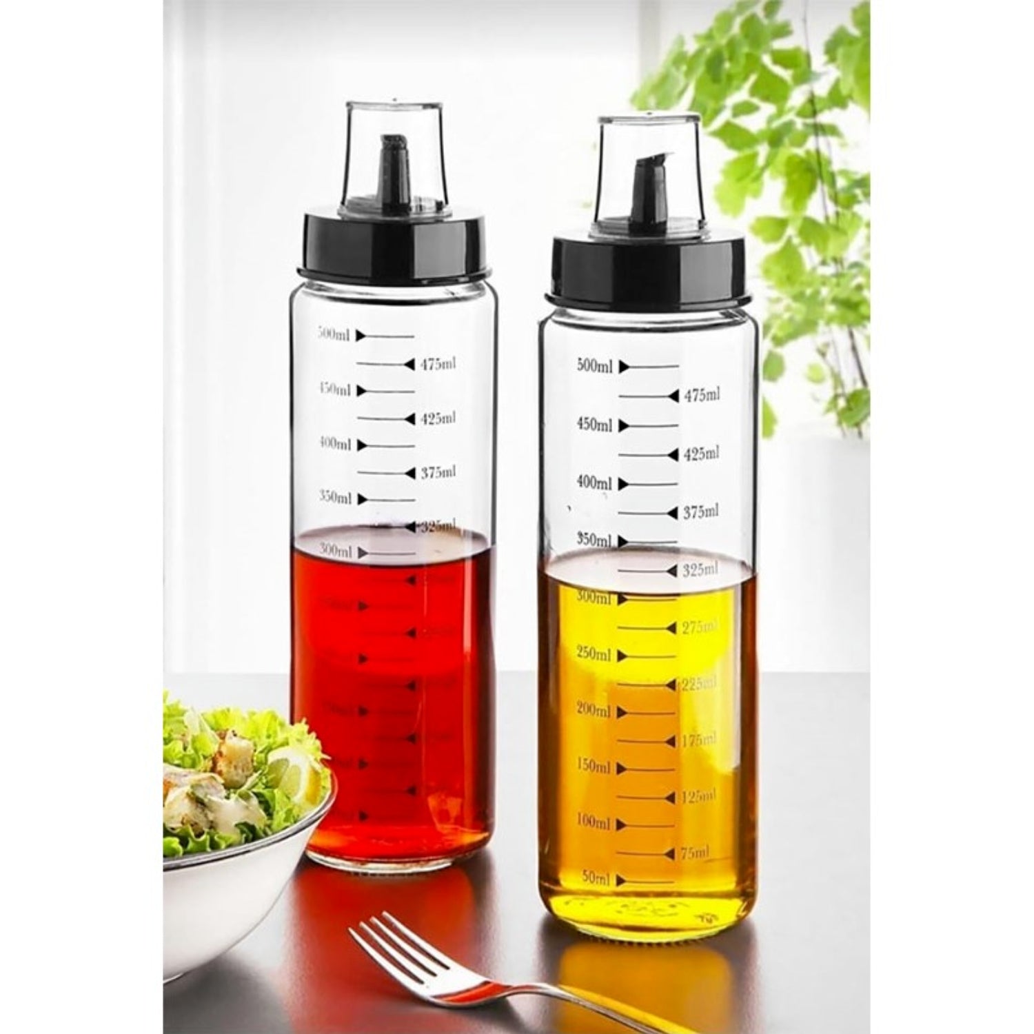 Elevate your kitchen setup with this 2-piece Clear Glass Oil Bottle Set. The bottles are designed with a black plastic pourer and lid for clean, controlled dispensing. The glass body features a built-in measurement indicator, making it perfect for precise oil usage while cooking. Compact and stylish, this set is a must-have for any kitchen.