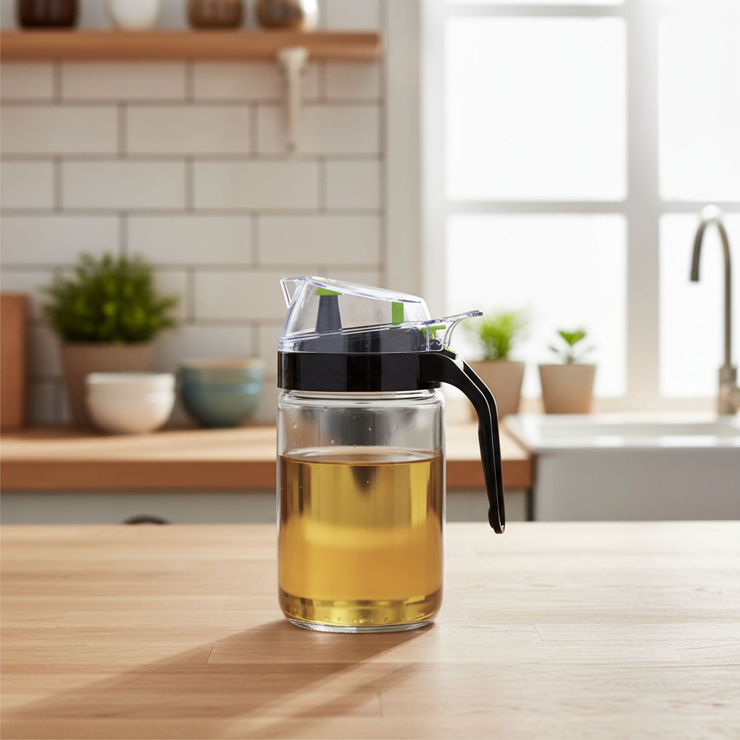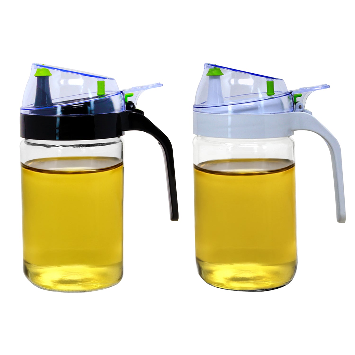 Transform your kitchen with this 2-piece Clear Glass Oil Bottle Set. It has a transparent, round body, sleek plastic pourer, and lid in black or white variation. Ideal for precisely storing and pouring vinegar, olive oil, or sauces. Its modern, minimalist design complements any kitchen style (random colour bottle is sent).