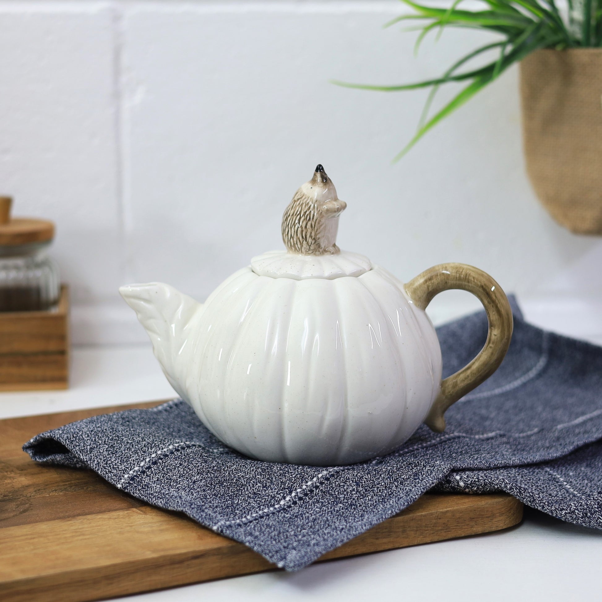 - Shaped like a white pumpkin with a cute hedgehog figurine sitting atop the lid, adding a whimsical touch to your tea service.