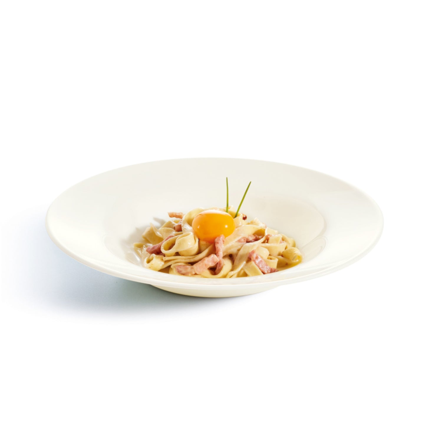 White round pasta plate measures perfect 28.5cm size for single pasta serving. Quality tableware made of high standard porcelain which is scratch resistant. High-density material is hence non-porous. Maintains a smooth finish.