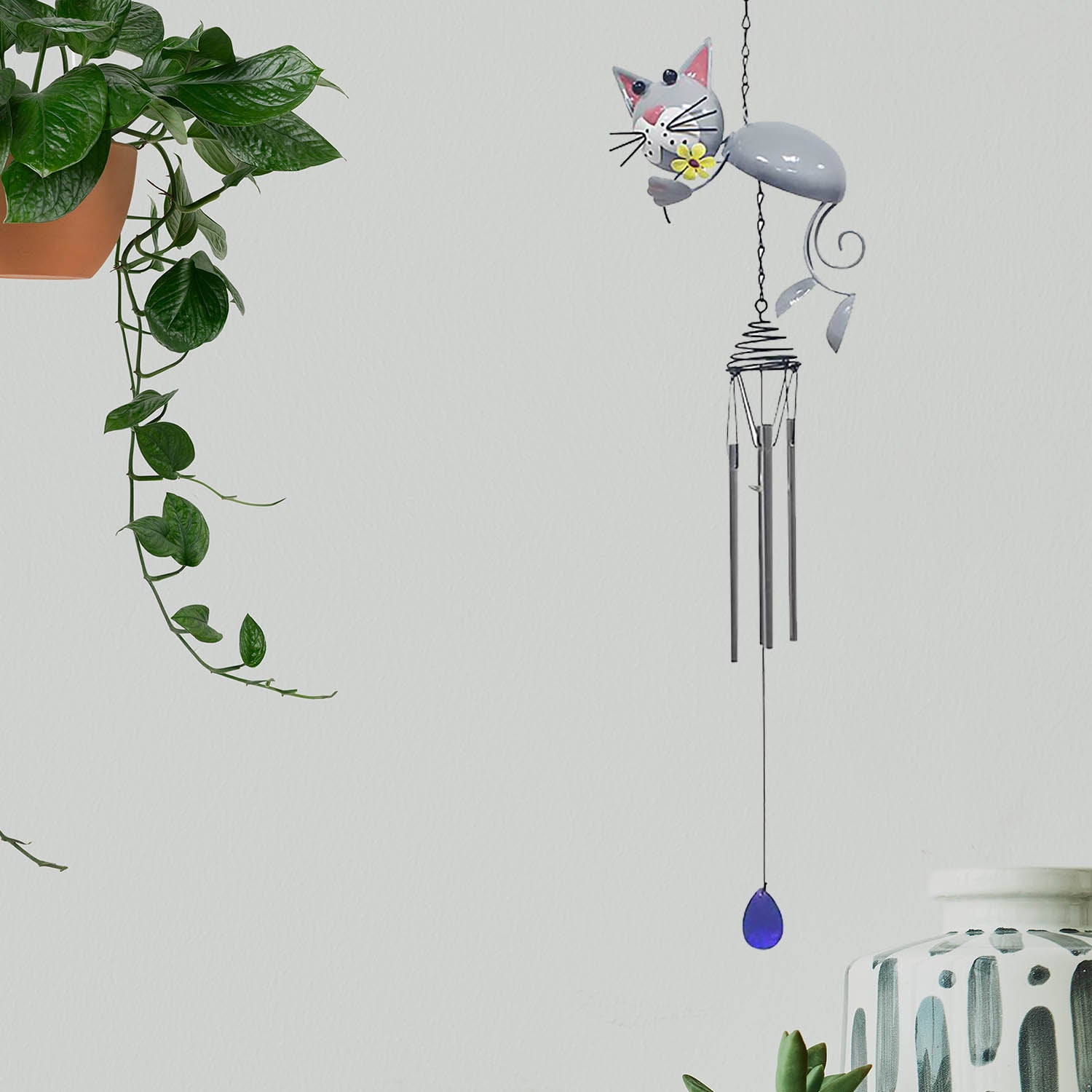 Elevate your outdoor ambiance with our set of metal wind chimes featuring an adorable grey cat figurine and hanging blue trinket. Easy to hang and designed for durability, this set of 2 wind chimes is a perfect addition to your garden, patio, or any outdoor space, bringing both visual and auditory delight to your outdoor haven.