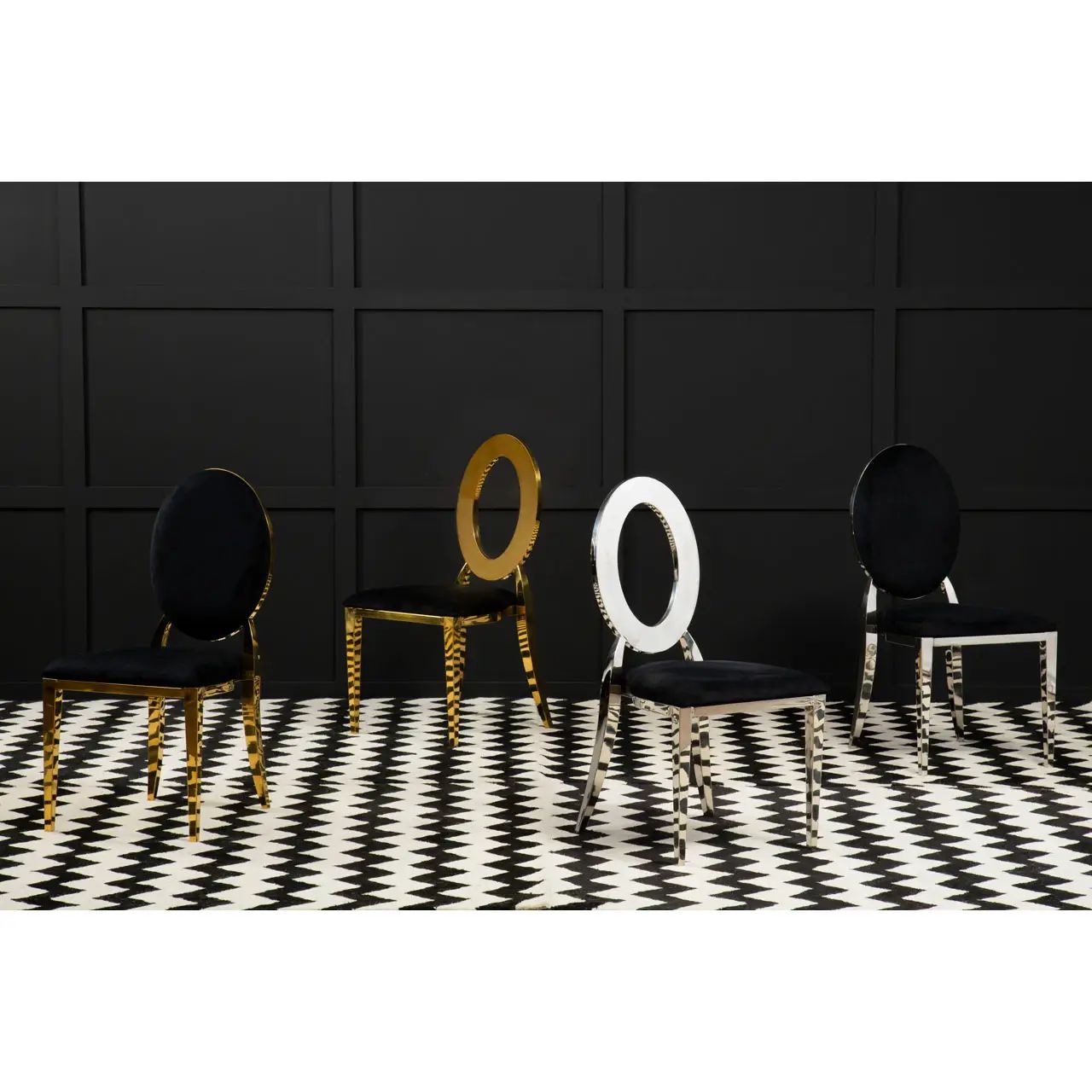 These chairs stands out with their stainless steel frame, boasting angular legs and an open oval back in a rich gold finish. The black velvet padded seat adds practicality while contrasting with the luxe lines of the elegant frame.