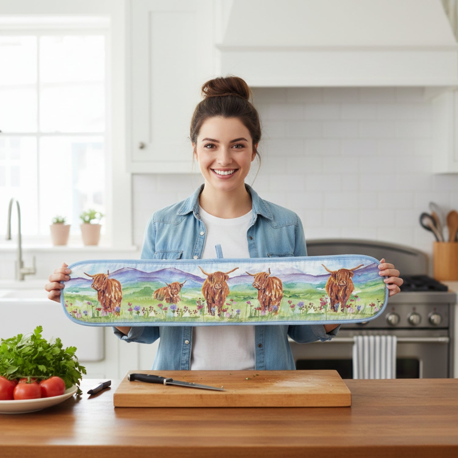 Bring a touch of countryside charm to your kitchen with this Highland Cows Apron and Double Oven Glove Set. Crafted from durable, soft cloth, this set features stunning Highland Cow artwork in vibrant colours. The apron offers excellent coverage with adjustable neck and waist ties, while the long oval-shaped oven glove with hanging loop ensures safe handling of hot pots and trays. Ideal for everyday cooking or as a thoughtful gift for kitchen lovers.
