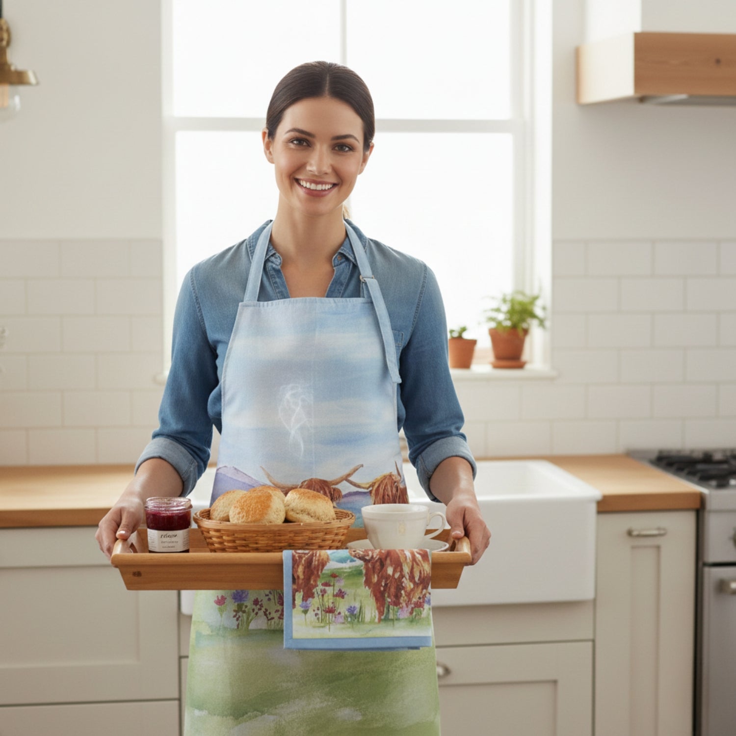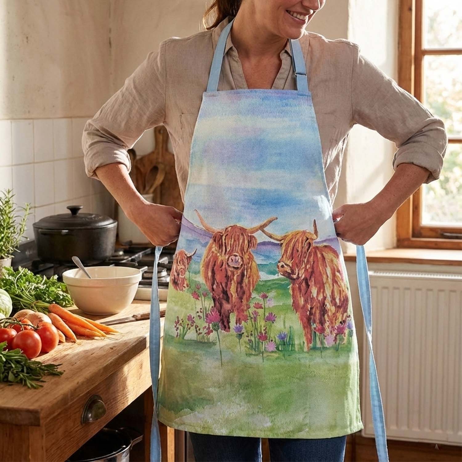 Add a touch of countryside charm to your kitchen with this Highland Cows Tea Towel and Apron Set. Crafted from durable, soft cloth, this set features stunning Highland Cow artwork in vibrant colours. The rectangular tea towel is ideal for drying dishes and hands, while the apron offers coverage with adjustable neck and waist ties for a comfortable fit. Perfect for everyday cooking or as a thoughtful gift for kitchen lovers.