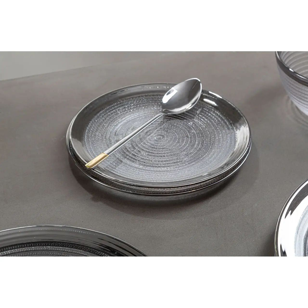 These clear glass charger plates feature an embossed spiral texture and a silver edge, adding sophistication and a modern touch to the dining table.