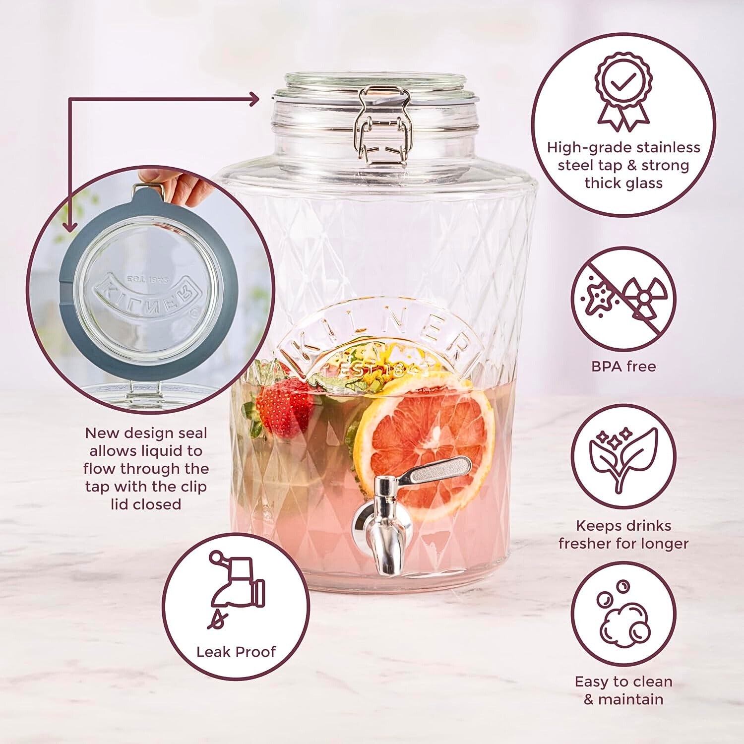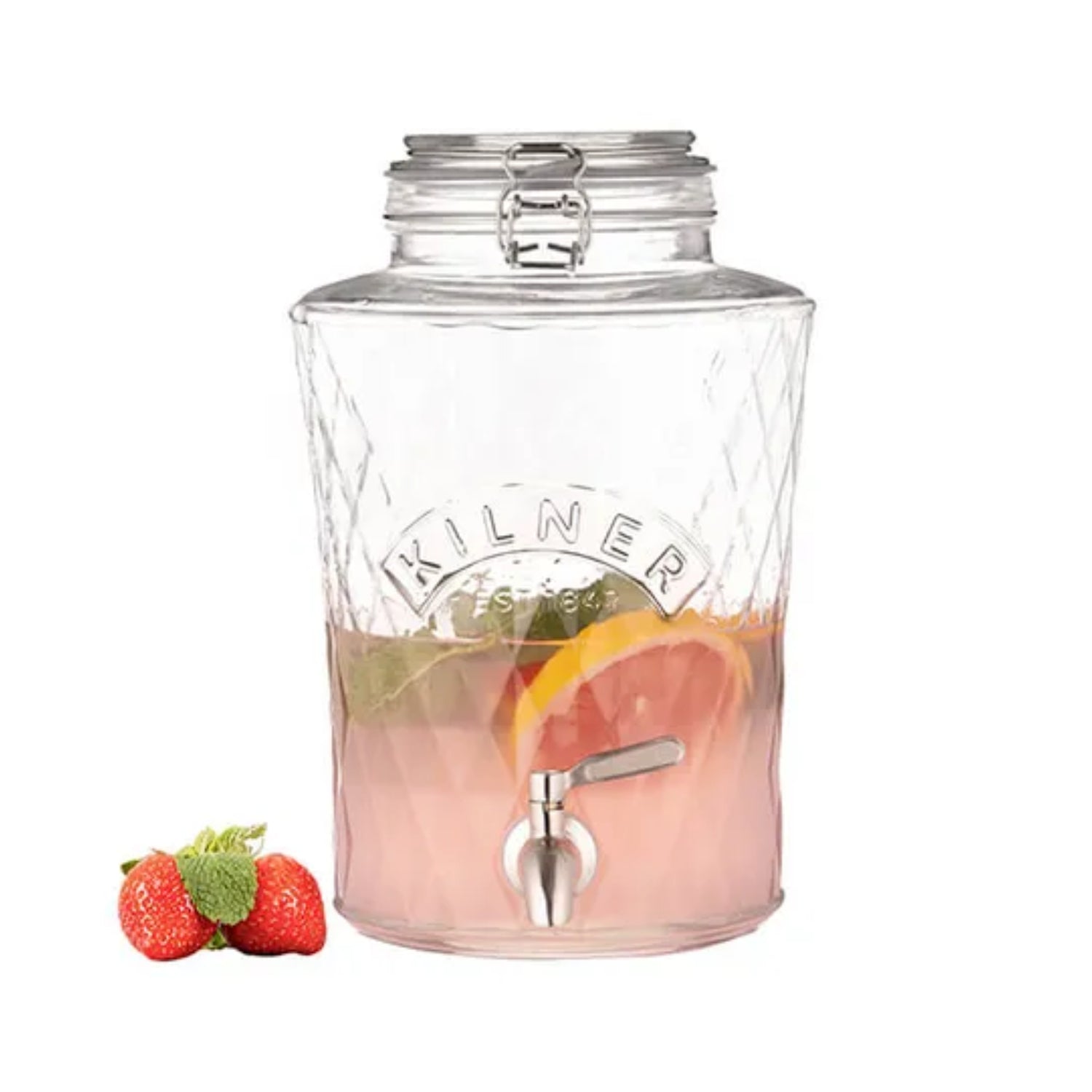 This Kilner clip top 2-piece diamond dispenser set serves and infuses various types of beverages such as fruit juices, cocktails, or soft drinks, making it ideal for home hosting and parties or even enjoying al fresco dining.