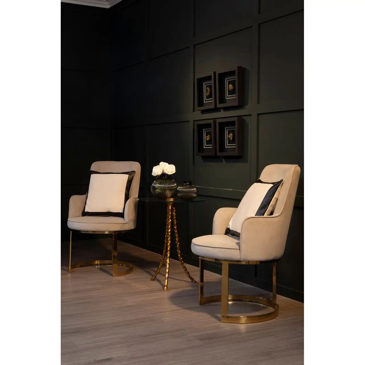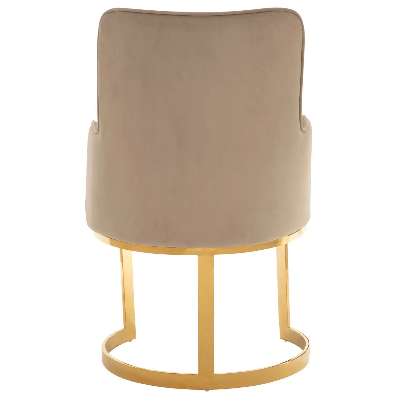Perched on a sleek stainless steel frame with a warm, luxurious finish, these dining chairs feature a beige velvet seat with a gently curved backrest and comfortable armrests.