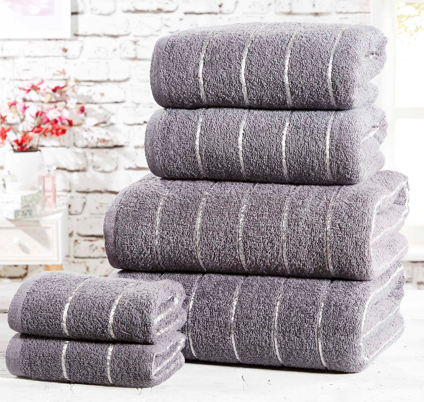 These luxurious, plush and designer towels are made from 100% cotton with metallic lurex striped design. It is ultra soft and absorbent. Material is 100% cotton and it is machine washable.