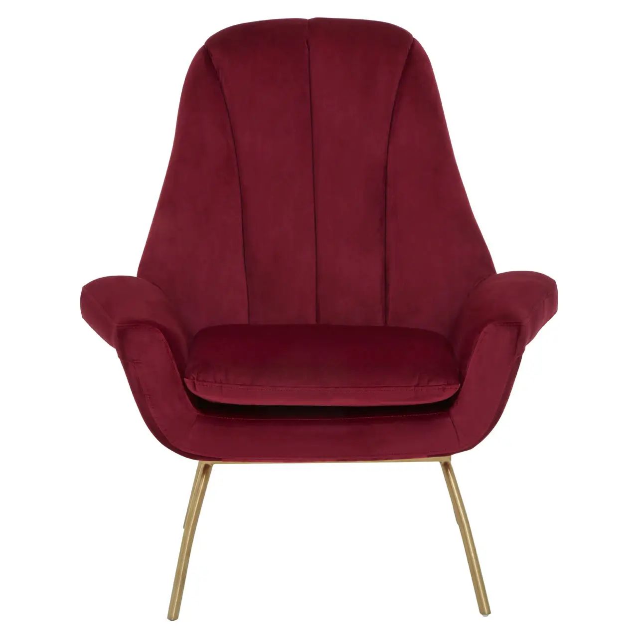 Wrapped in lavish wine velvet, these chairs bring a luxe touch to the living room with its plush padding. Slender gold-finish stainless steel legs complement the high back, channel-tufted backrest, and low armrests for a modern, decorative look.