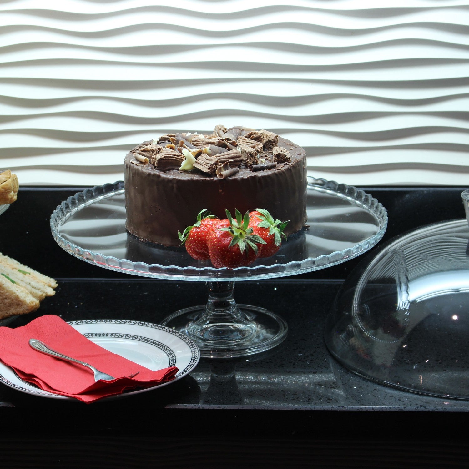 This Banquet Plateau with Glass Dome is the Ideal way to display, protect and preserve your cakes or treats. Made from durable glass material and domed glass lid with a knob for easy removal. Perfect centerpiece for your table.
