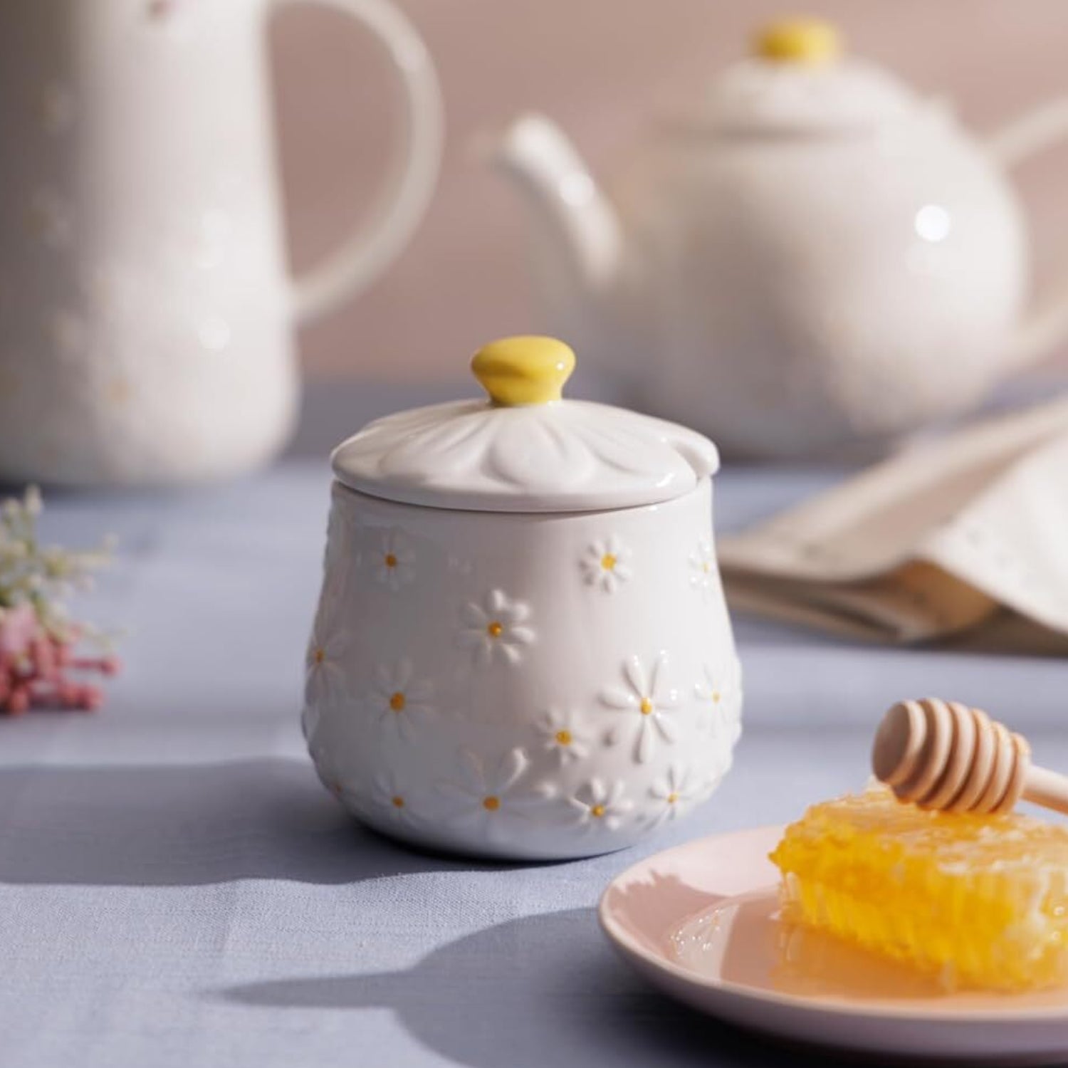 This charming Price & Kensington Daisy 2-piece ceramic honey pot and drizzler set (11.4 cm tall) features a daisy-inspired embossed design with a bright yellow knob, ideal for neat and stylish honey serving in any kitchen or breakfast table.