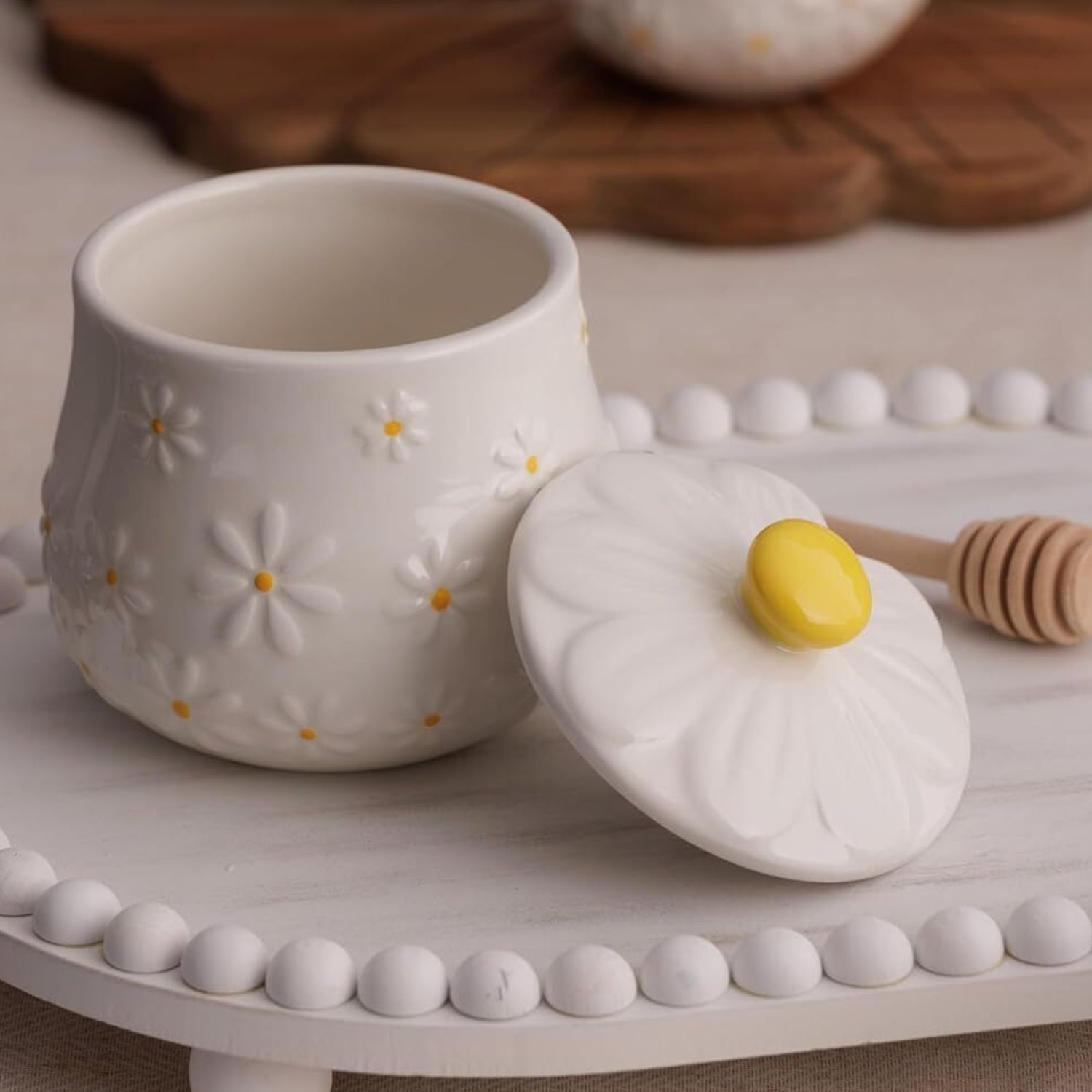 - Features a textured daisy petal pattern on a rounded body and lid, finished with a cheerful yellow knob.