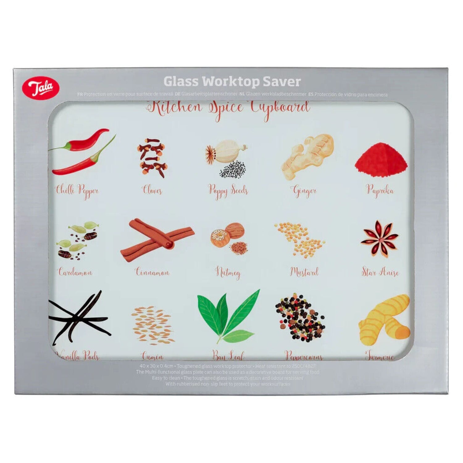 The Tala spice glass worktop saver is an easy way to keep your kitchen surfaces or tables clean, whilst offering a hygienic surface to serve food. The Tala Worktop Saver will protect your surfaces in the kitchen.